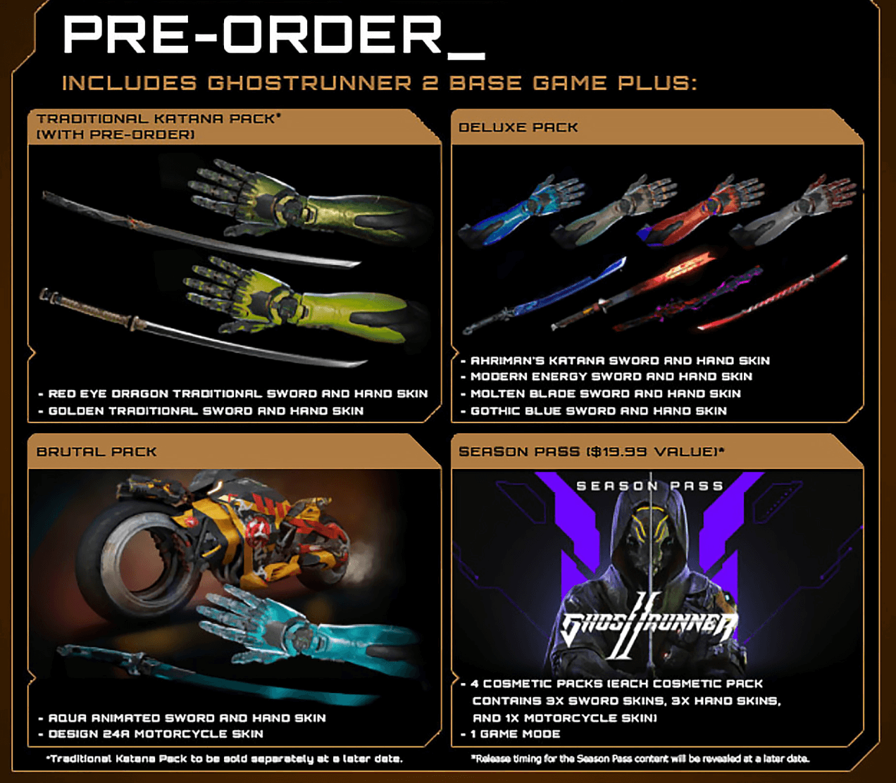 Предзаказ Ghostrunner 2 будет открыт вплоть до момента релиза. Независимо от издания обладатели предварительного заказа получат набор скинов для катаны и руки «Красноглазый дракон» и «Золотой традиционный меч». Позднее каждый сможет приобрести расцветки в комплекте Traditional Katana.