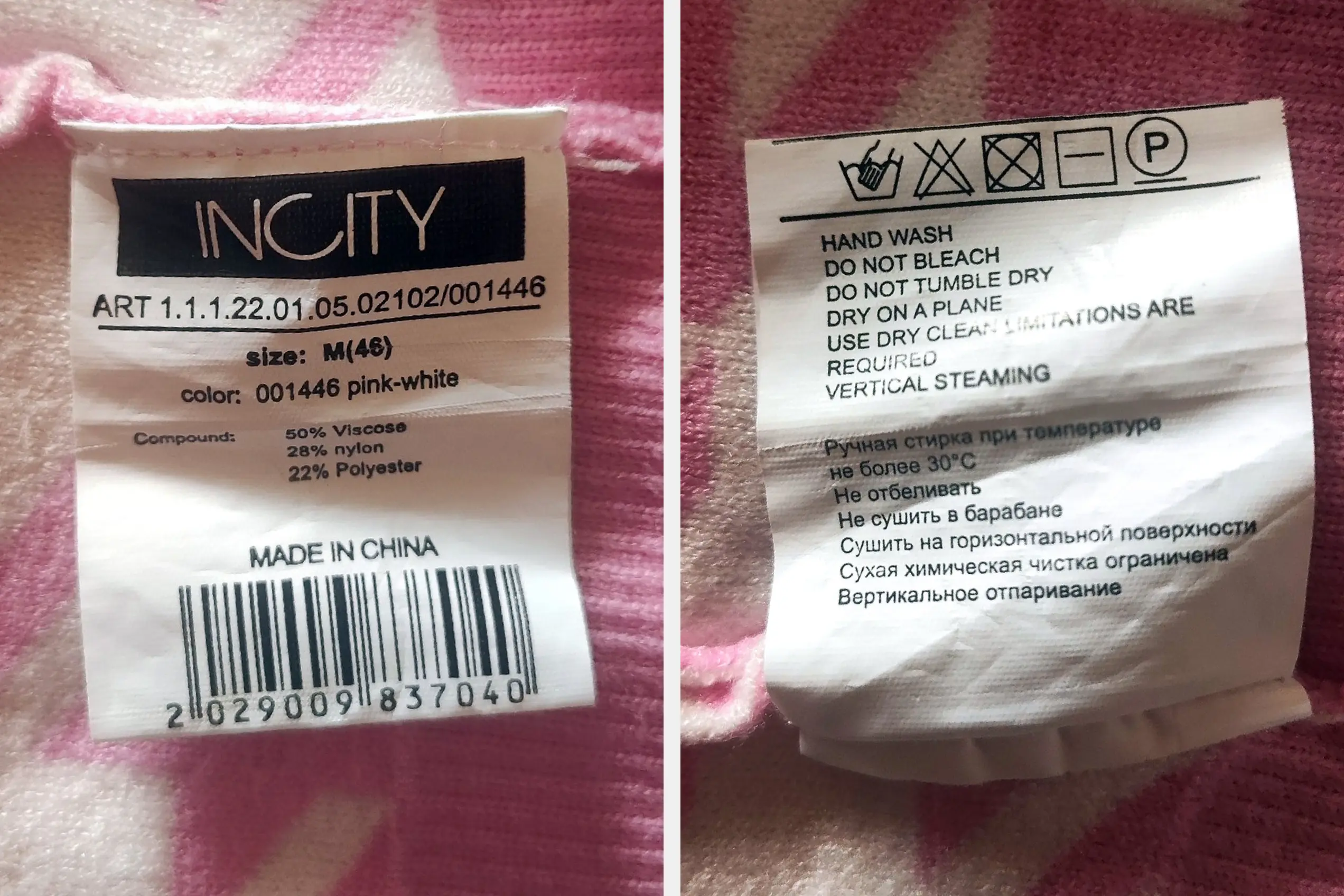 - состав ткани с процентным соотношением волокон: 50% — вискоза, 28% — нейлон, 22% — полиэстер;