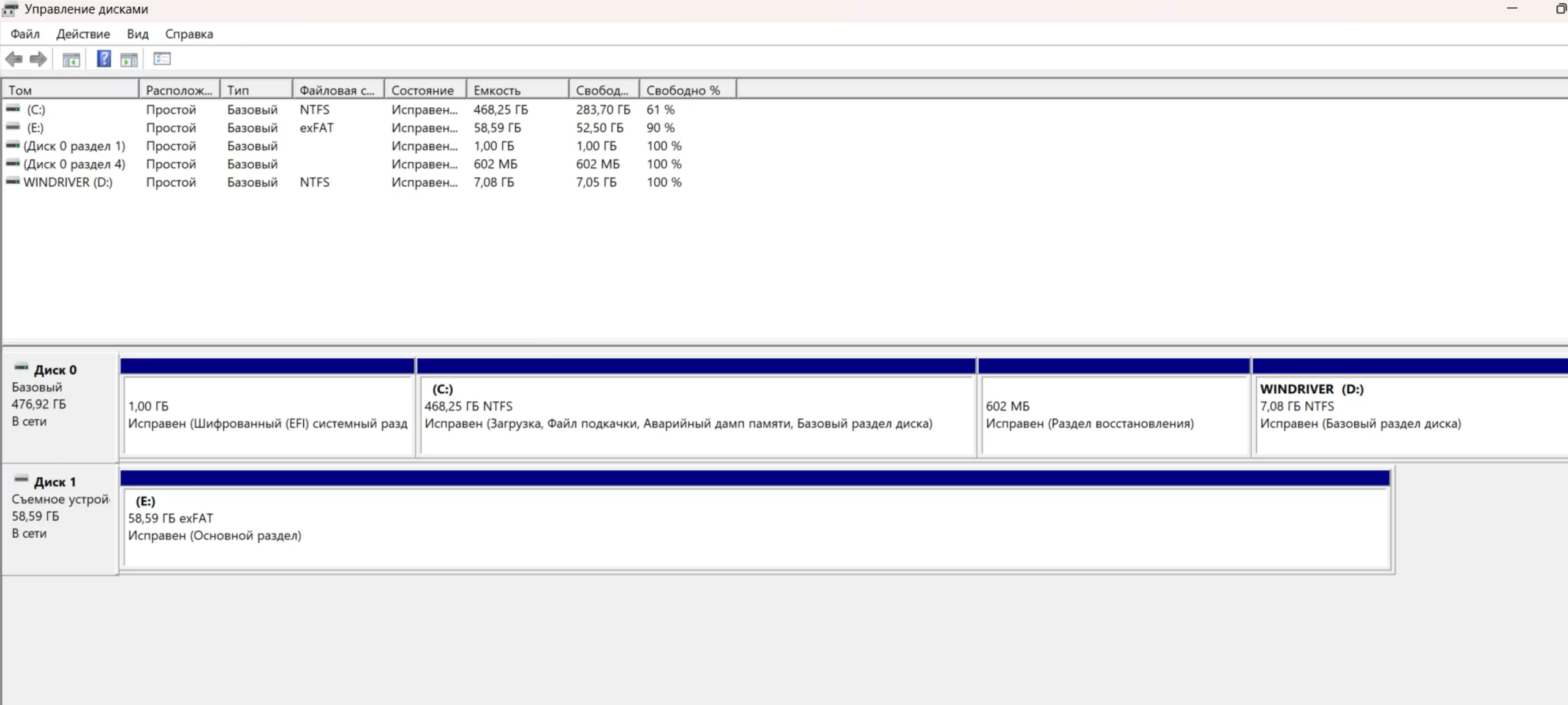 - Запустите программу «Управление дисками» любым удобным способом. Вы увидите все подключенные диски.