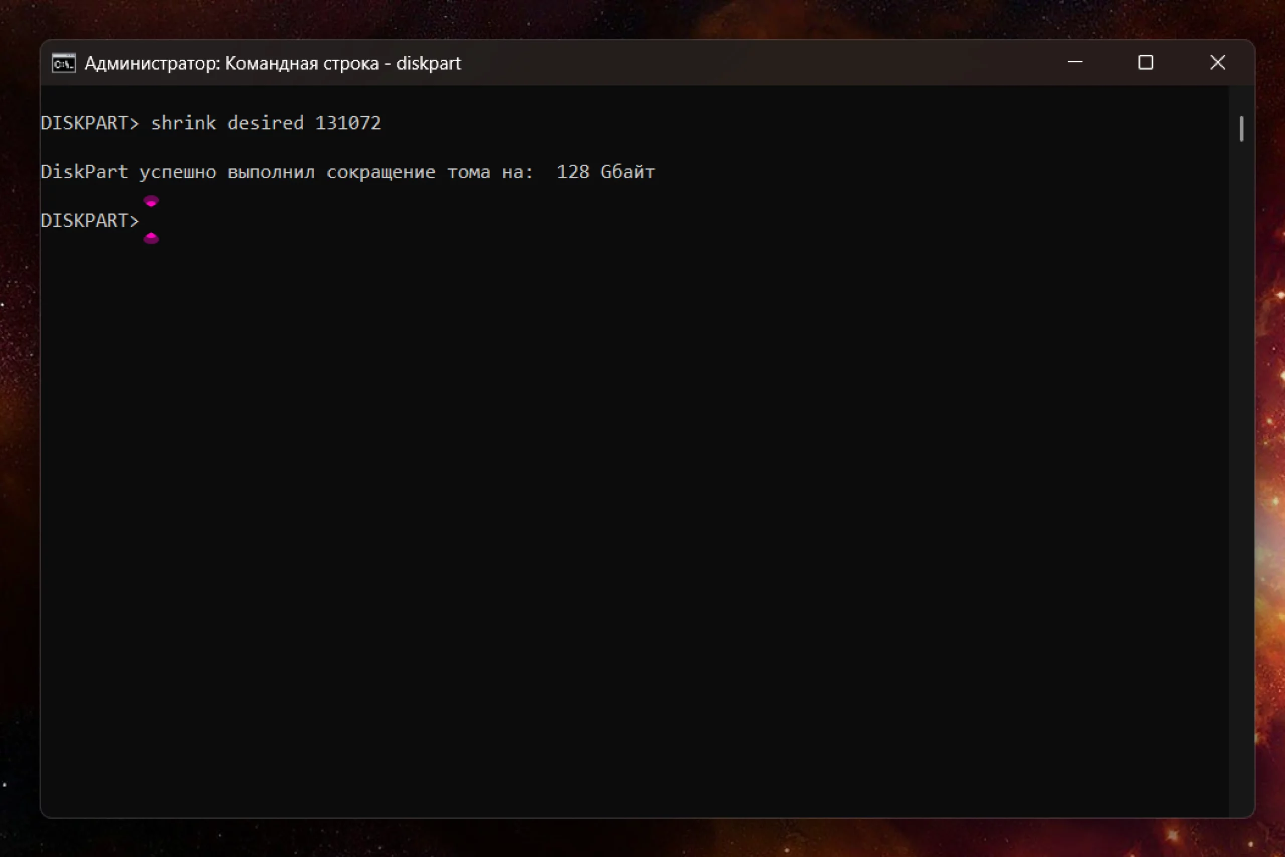 4. Создайте незаполненное пространство командой shrink desired=N, где N — объем в мегабайтах. Например, команда shrink desired=131 072 создаст раздел на 128 ГБ.