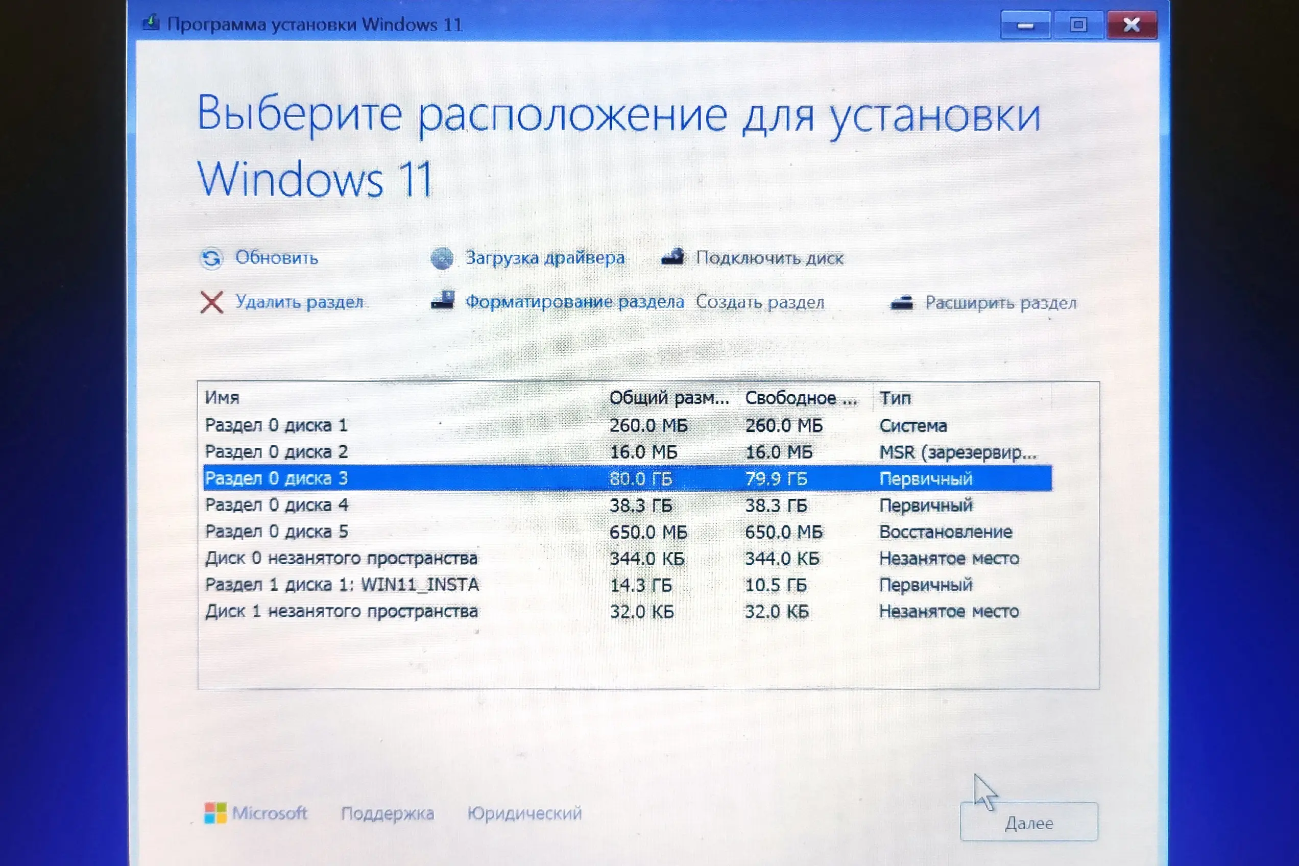 5. Отформатируйте оба тома. А затем выберите тот, куда хотите установить Windows. Нажмите «Далее» — и дождитесь, пока установится система.