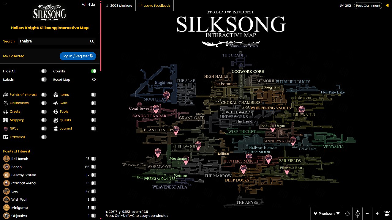 Просто откройте нужные слои «Vendors/Shakra» или воспользуйтесь поиском по карте игры Hollow Knight: Silksong, чтобы быстро спланировать маршрут.