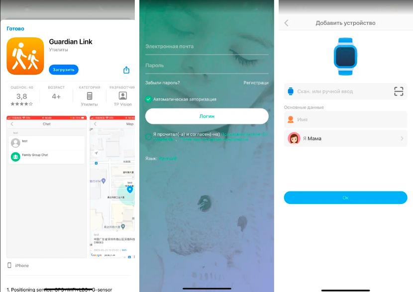 Для сопряжения часов со смартфоном родителю необходимо скачать приложение Guardian Link. Внести данные или зарегистрироваться, потом считать QR-код, который находится в часах в разделе Устройство ► Приложение или внести Устройство ► Рег код.