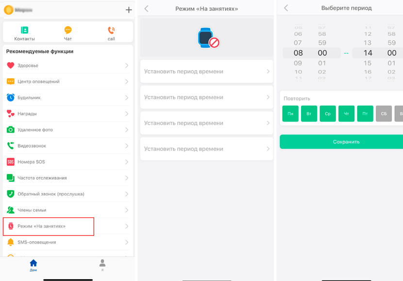 В пункте меню «на занятиях» можно настроить расписание, когда ребенок находится на уроках. В этом случае часы будут работать в режиме «без звука». Это означает, что не будет поступать никаких сигналов и уведомлений, что позволит ребенку не отвлекаться во время занятий.