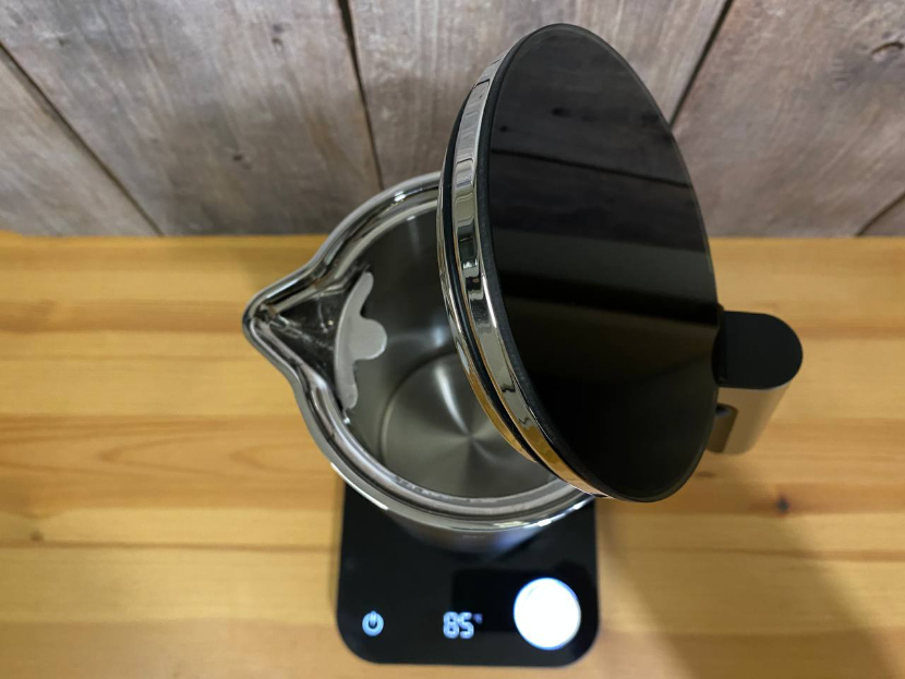 Как я уже говорил, внутри чайник полностью металлический. Соответственно, ни о каком запахе пластика и речи не идет. Нет ни запаха, ни какого-либо постороннего вкуса у воды после кипячения. Крышка открывается широко, что облегчит дальнейшую очистку чайника. Пока что он чистый и ухода не требует, но, рано или поздно придется этим заняться. Поэтому хорошо, что крышка открывается широко и само отверстие широкое — рука пролезет при необходимости.