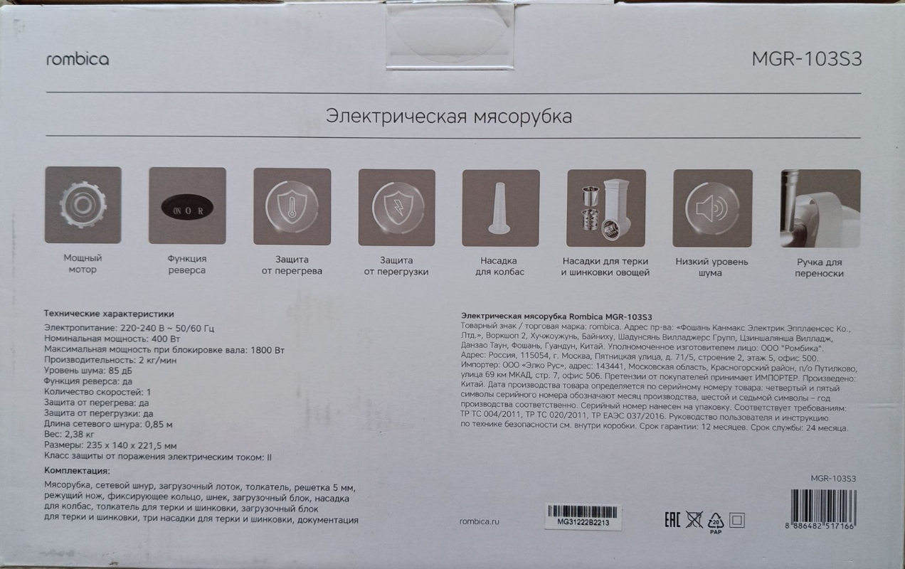 Фирма Rombica родом из Сингапура, производство Китай, гарантия один год. Несмотря на низкую цену мясорубка имеет неплохие характеристики: