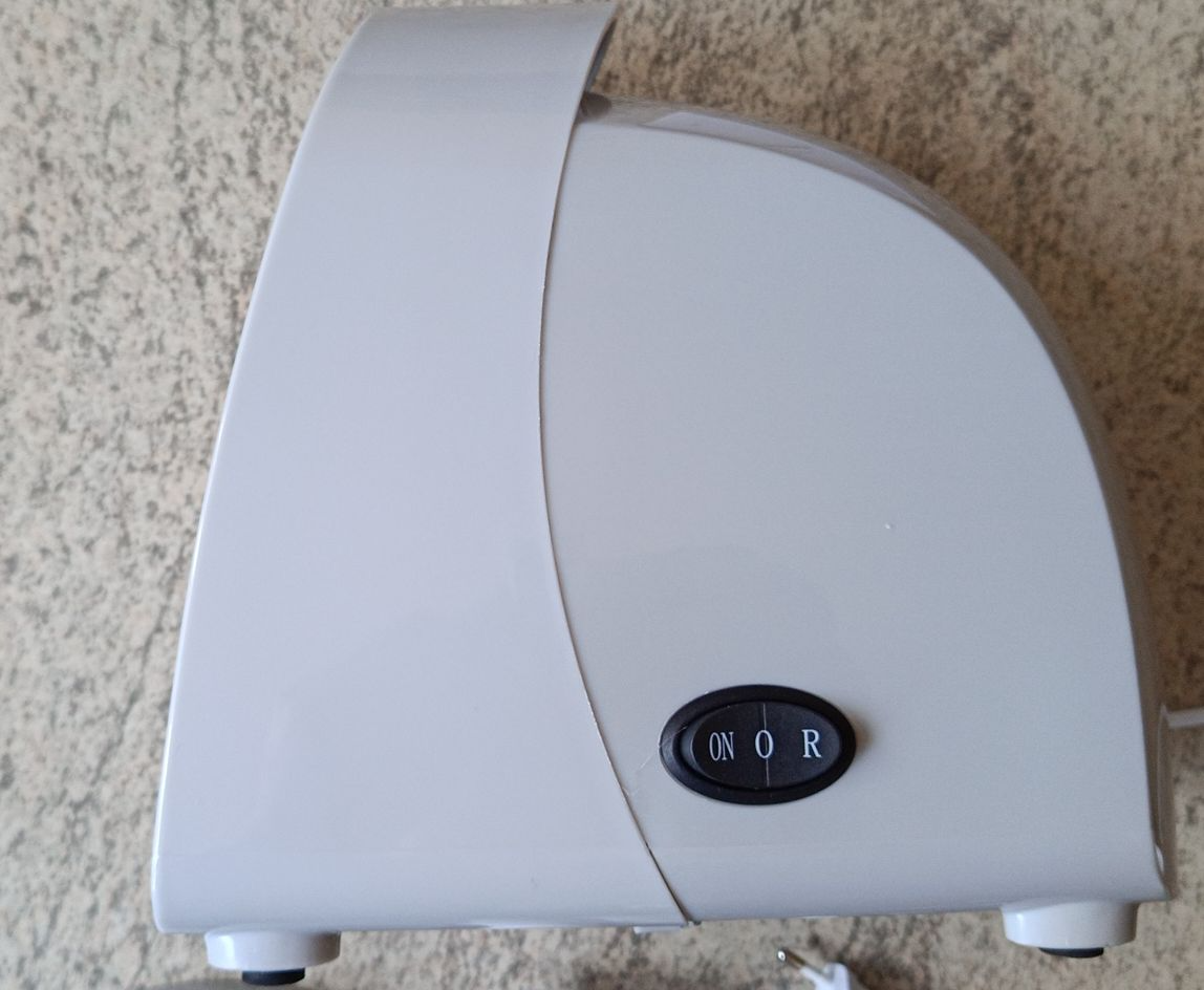 Сразу решили проверить мясорубку в работе. Упакован товар в крепкую картонную коробку в разобранном виде. Чем отличаются современные мясорубки, так это продуманным дизайном. Цвет светло-серый, немаркий. Сверху удобная ручка для переноски. Насадки внутрь не убираются ввиду небольшого размера самого аппарата. На лицевой панели имеется клавиша на три положения: 0 — режим выключено, IN — фиксированная кнопка включения и кнопка R — реверс, необходимая, когда застряли жилы внутри.