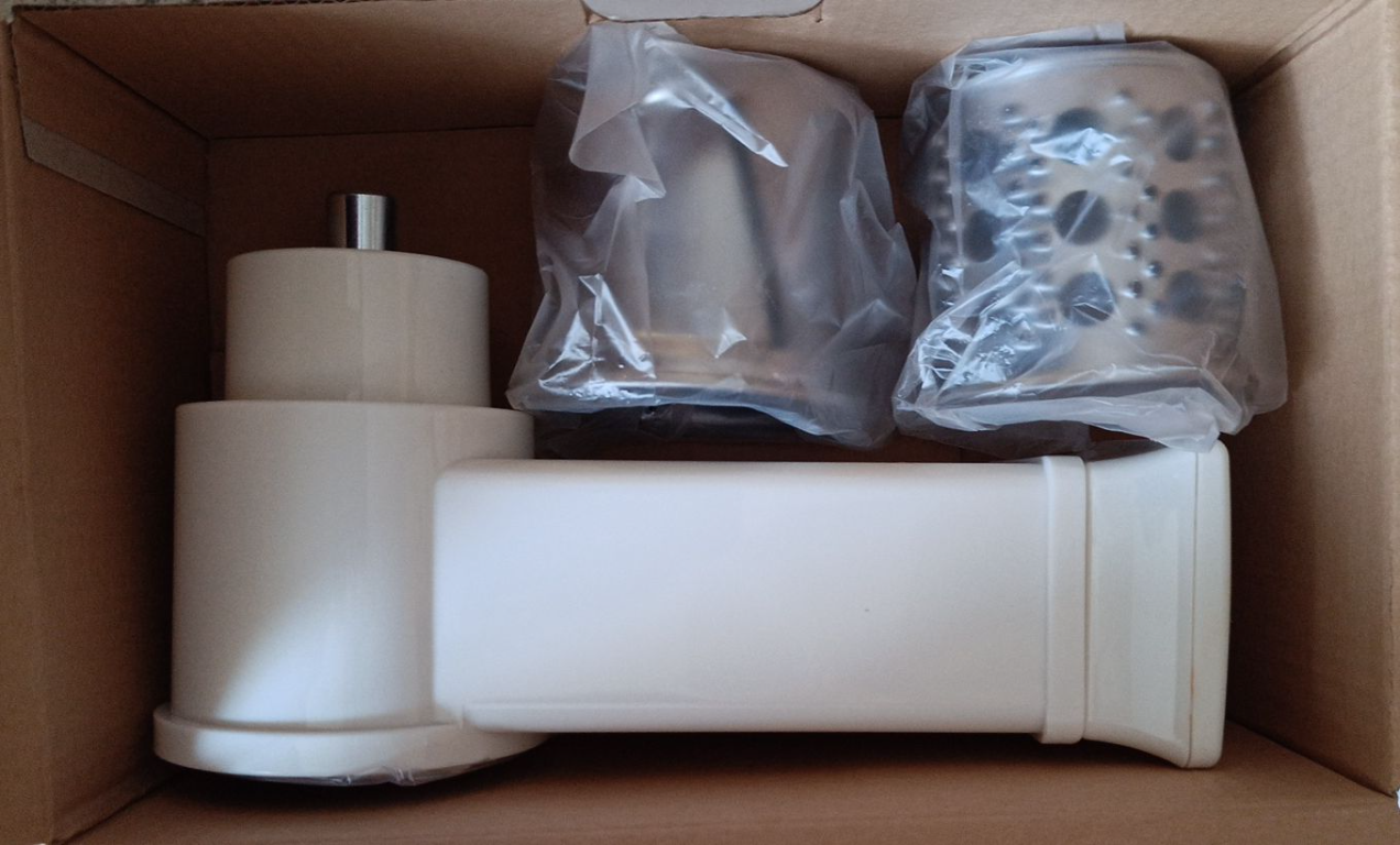 Набор насадок стандартный. Есть загрузочный блок для терки и шинковки с насадками, плюс насадка для колбас. К сожалению, решетка только одна размером 5 мм. При необходимости придется докупать дополнительную насадку с другими размерами.