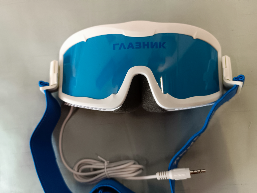 Внешне аппарат напоминает горнолыжную маску. Приятные мягкие уплотнители позволяют плотно прилегать очкам к лицу. Резинка для крепления регулируется под любой размер головы.