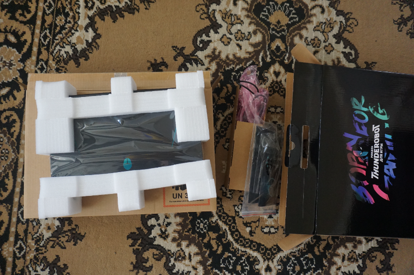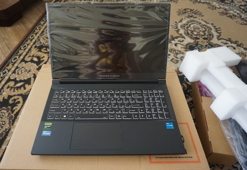Упакован ноутбук хорошо, помимо самой защитной оболочки, есть подложка между клавиатурой и экраном. В комплектацию входит сам ноутбук, зарядное устройство мощностью 150W, инструкция эксплуатации, фирменная наклейка, сама коробка и еще одна, коробка в коробке.