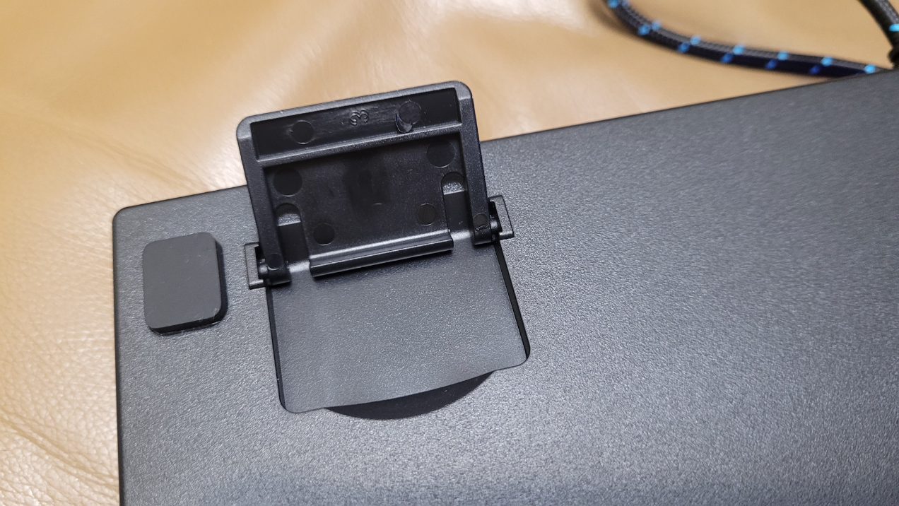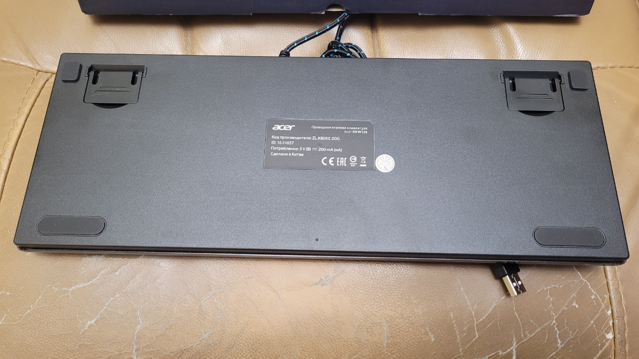 Верхняя панель клавиатуры — металл, сама клавиатура увесистая. Неподвижно стоит на резиновых ножках. Есть и откидные ножки сзади, они без резины. Но в целом, вроде в этом случае хватает и двух передних резинок, скольжения нет.