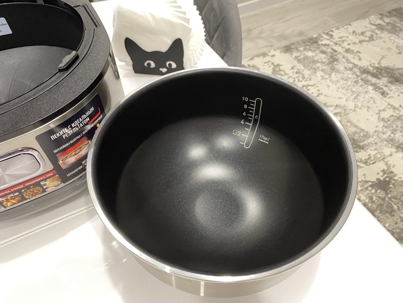 Чаша при этом достаточно увесистая, как, в принципе, у всех мультиварок с индукционным нагревом. Внутреннее покрытие антипригарное. Очень качественное, и при бережном уходе его должно хватить надолго. Это я уже исхожу из опыта использования сковородок Tefal.