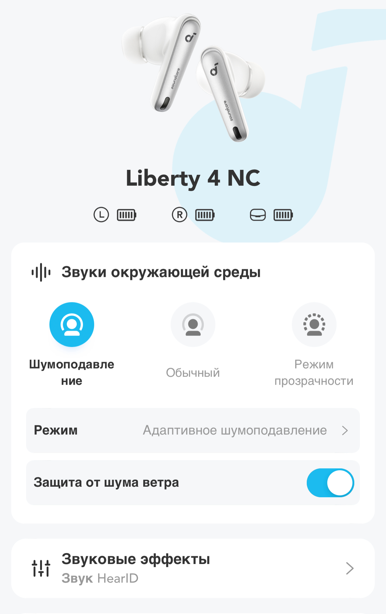 Как по мне, все эти режимы можно свести к двум. Первый — режим адаптивного шумоподавления, второй — режим прозрачности, причём полной. Различить эти режимы легко, в одном случае вы получаете почти абсолютную ватную тишину в наушниках, в другом — чёткую слышимость каждого элемента окружения. Отрадно, что подавитель шума ветра сделан отдельным переключателем в приложении и может использоваться в любом из режимов.