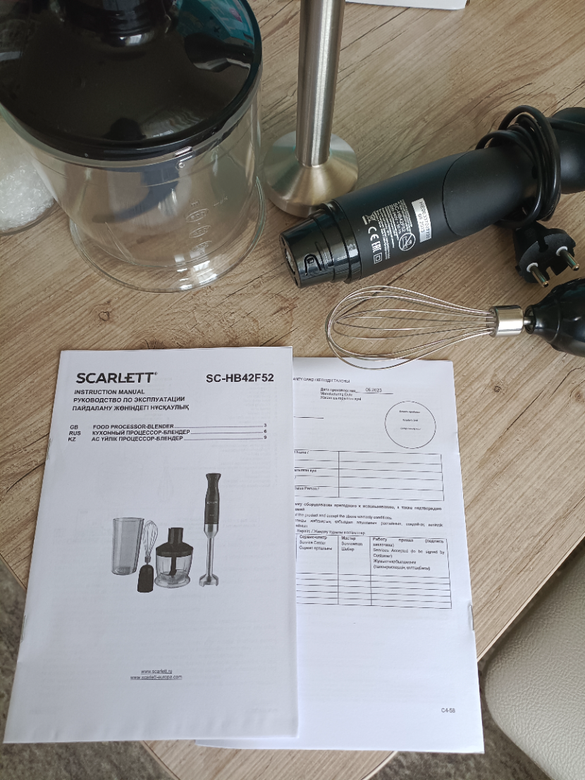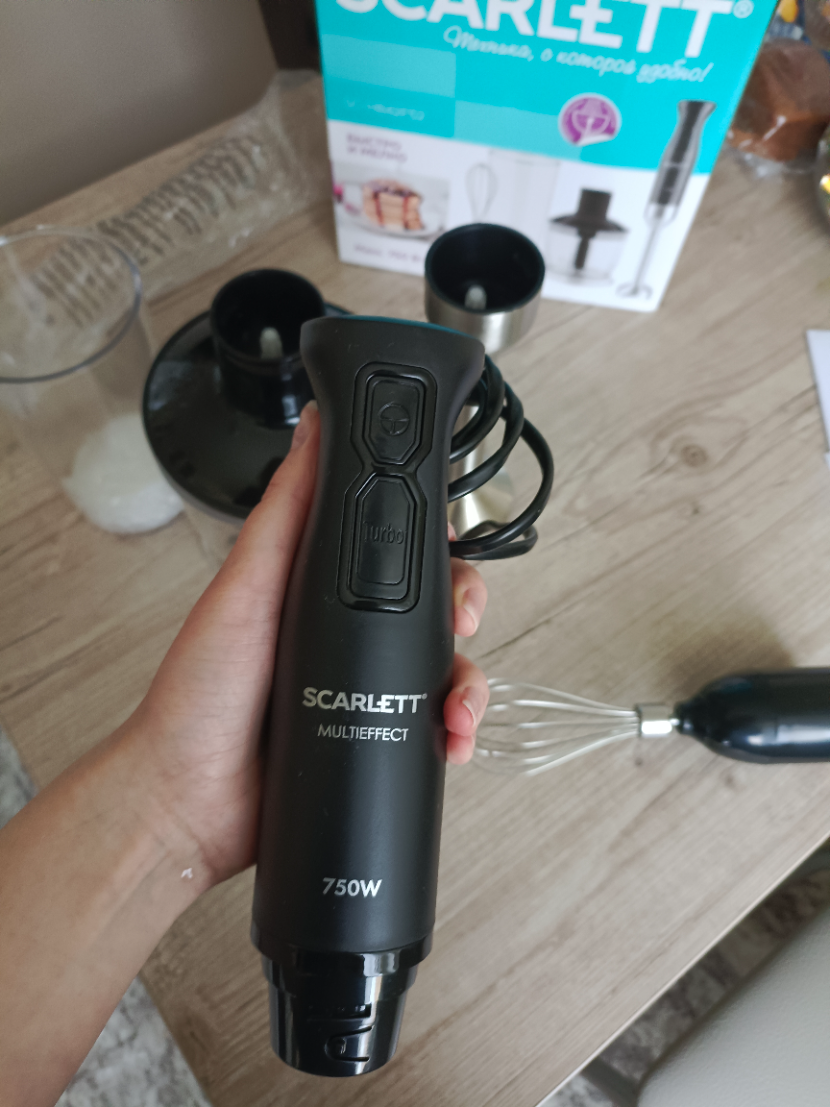 Подводя итог, могу сказать, что я полностью довольна погружным блендером Scarlett SC-HB42F52 и не жалею о своей покупке. Блендер однозначно подойдёт для готовки на обычной домашней кухне. Он обладает всеми необходимыми функциями, легко собирается, разбирается, моется и не требует каких-либо профессиональных навыков. Также одним из плюсов является компактный размер (коробка примерно 30×20×15), блендер не занимает много места, но при этом приносит много пользы.