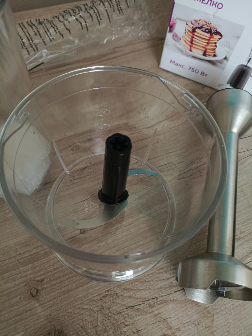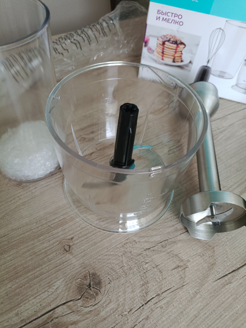 В комплект блендера входят насадка-лезвие, насадка-венчик, насадка-блендер, мерная чаша, мерный стакан и сам блок управления.