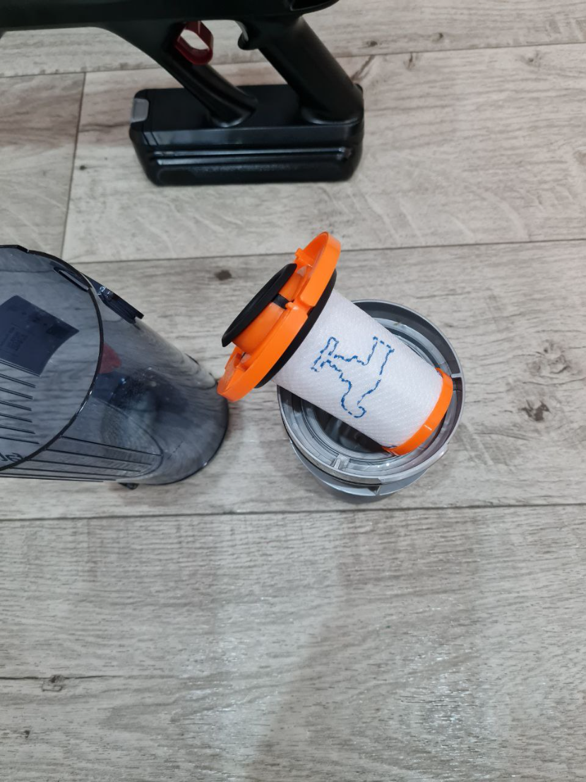 Контейнер небольшой, но при ежедневной уборке наполняется долго. Прочищается очень легко. Тянешь за кнопку и мусор высыпается, также при помощи кнопки снимается контейнер. Всё просто, потому как есть указатели. Наглядно всё понятно, куда потянуть, куда нажать.