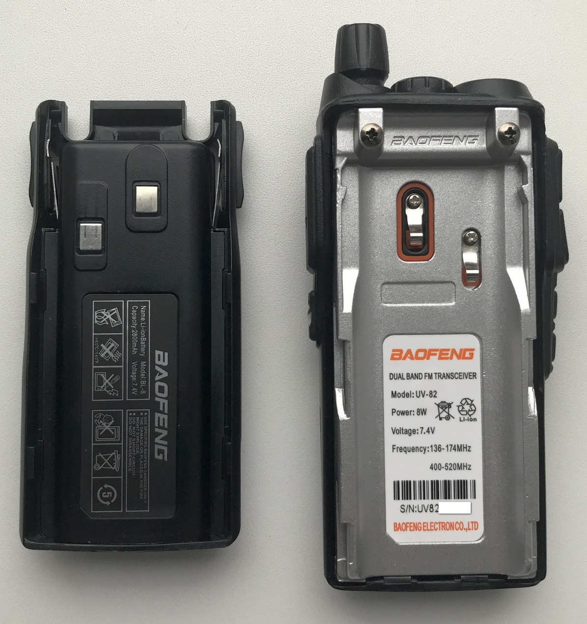 Если на внутренней стороне радиостанции под аккумулятором указана модель Baofeng UV-82 8W, то имеем мощность 8 Вт, если нет — то 5Вт.