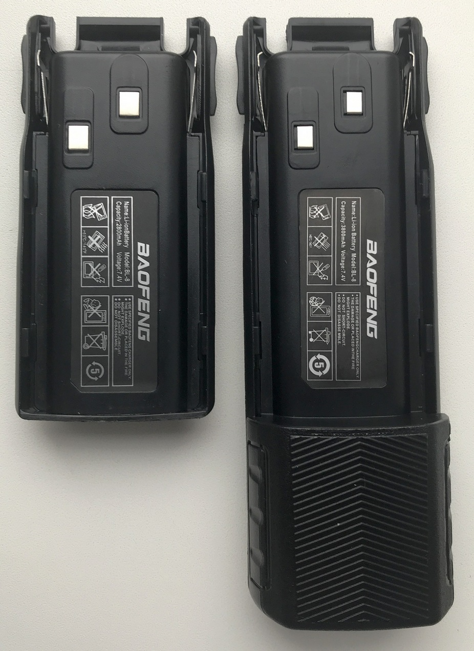 По рабочим характеристикам аккумулятор Baofeng UV-82 (8W) 2800 mAh примерно чуть мощнее аккумулятора модели Baofeng UV-5R 1800 mAh, увеличенный — 3800 mAh (размеры можно сравнить на представленном фото). Если производитель где-то и приукрасил емкость в 2800 mAh, то не так критично. Истинна, скорее всего, где-то посередине.