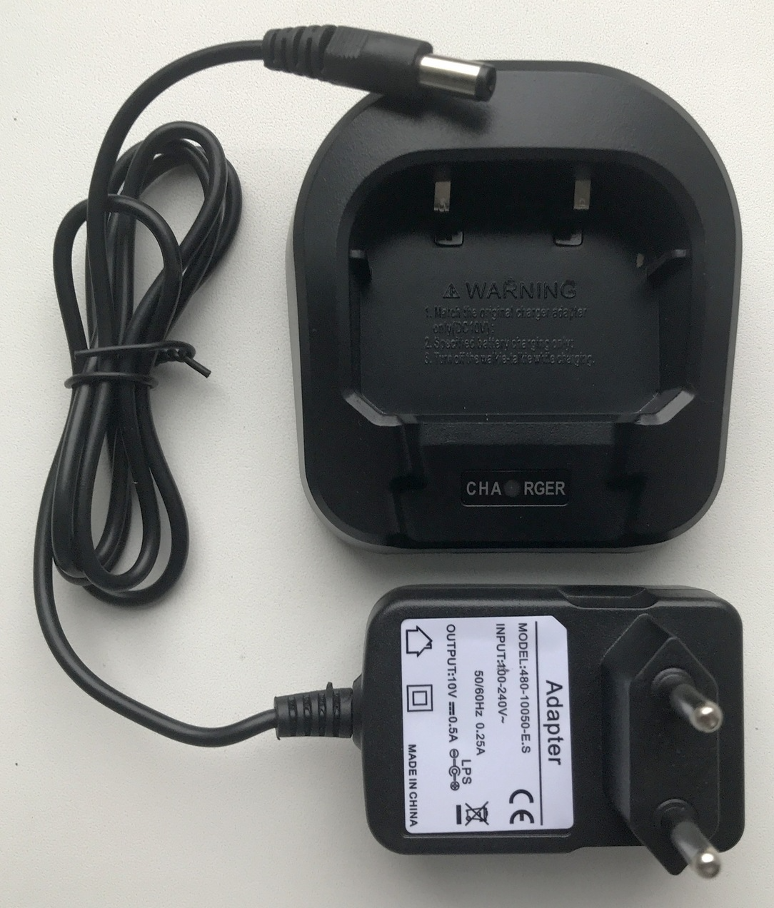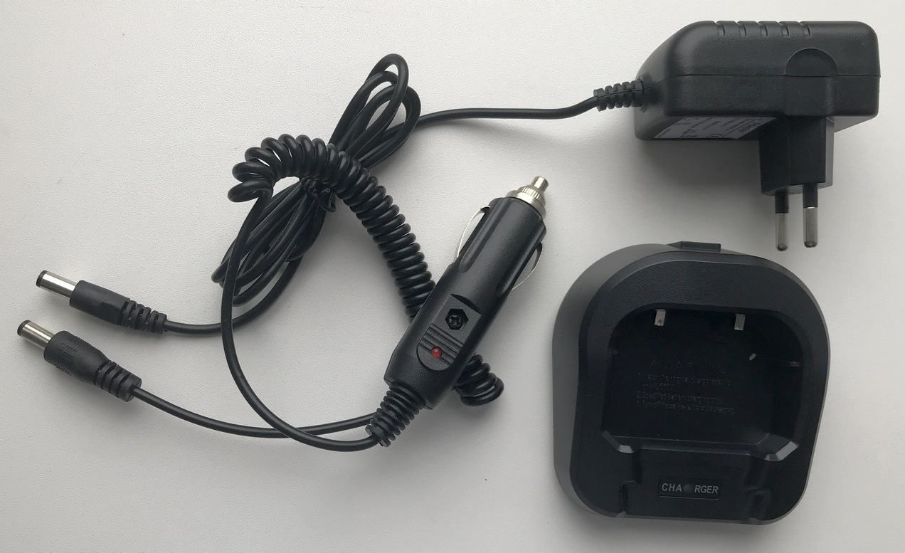Зарядное устройство, включающее в себя зарядный стакан с возможностью зарядки как отдельного аккумулятора, так и радиостанции целиком, и блок питания 5W — 10 В 0,5 A.