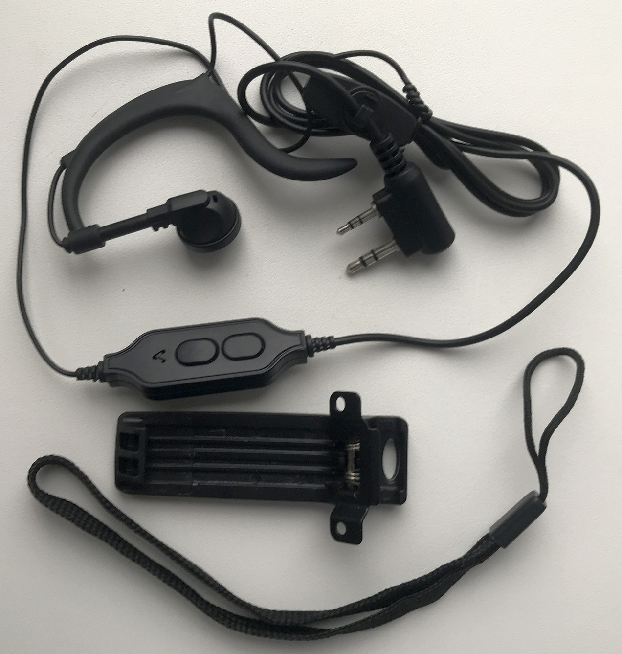 Гарнитура двухканальная (имеет две кнопки). Клипса. Темляк. Инструкция.