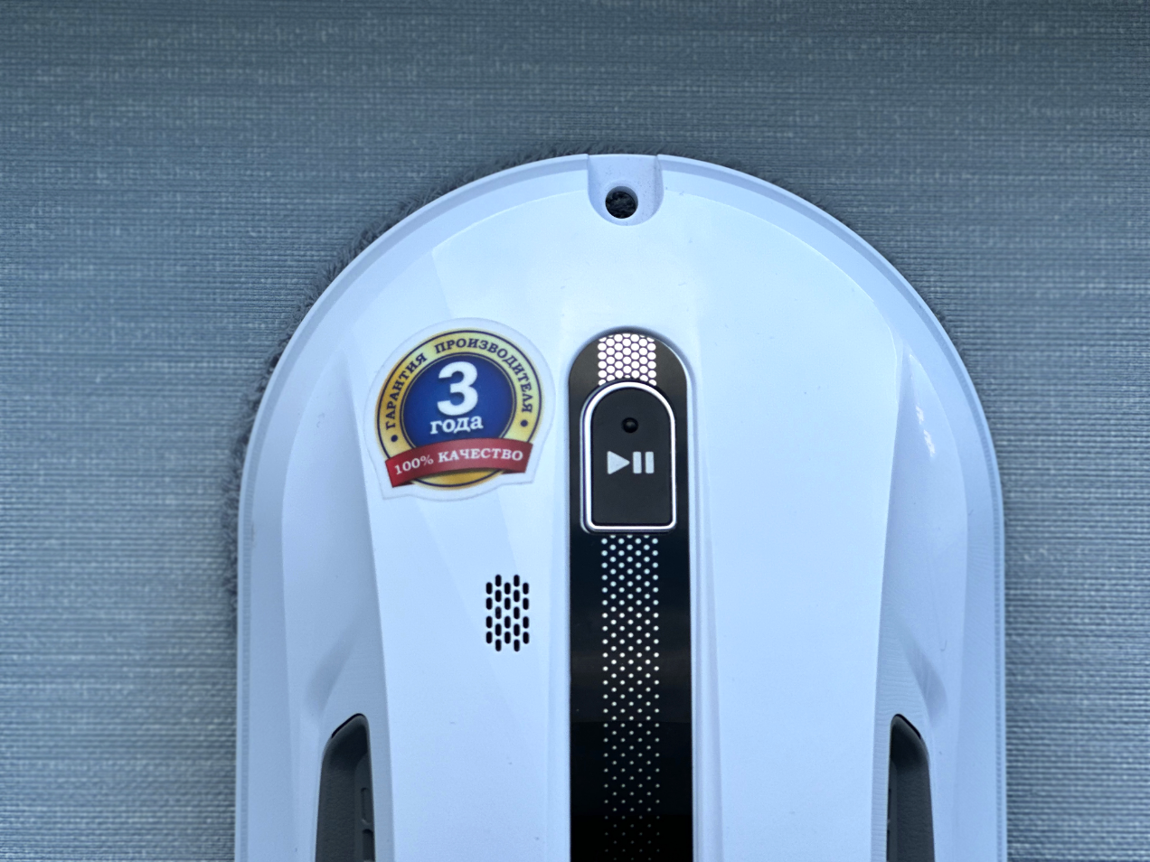 С одного края робота расположена кнопка старт/пауза, слева от нее динамик и наклейка с информацией, что производитель наделил устройство трехлетней гарантией.