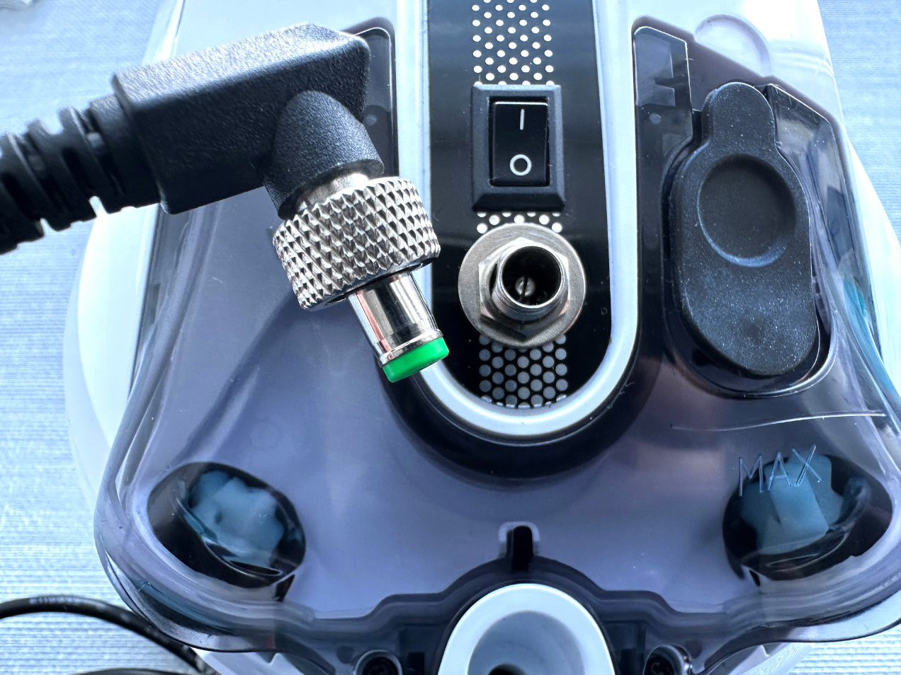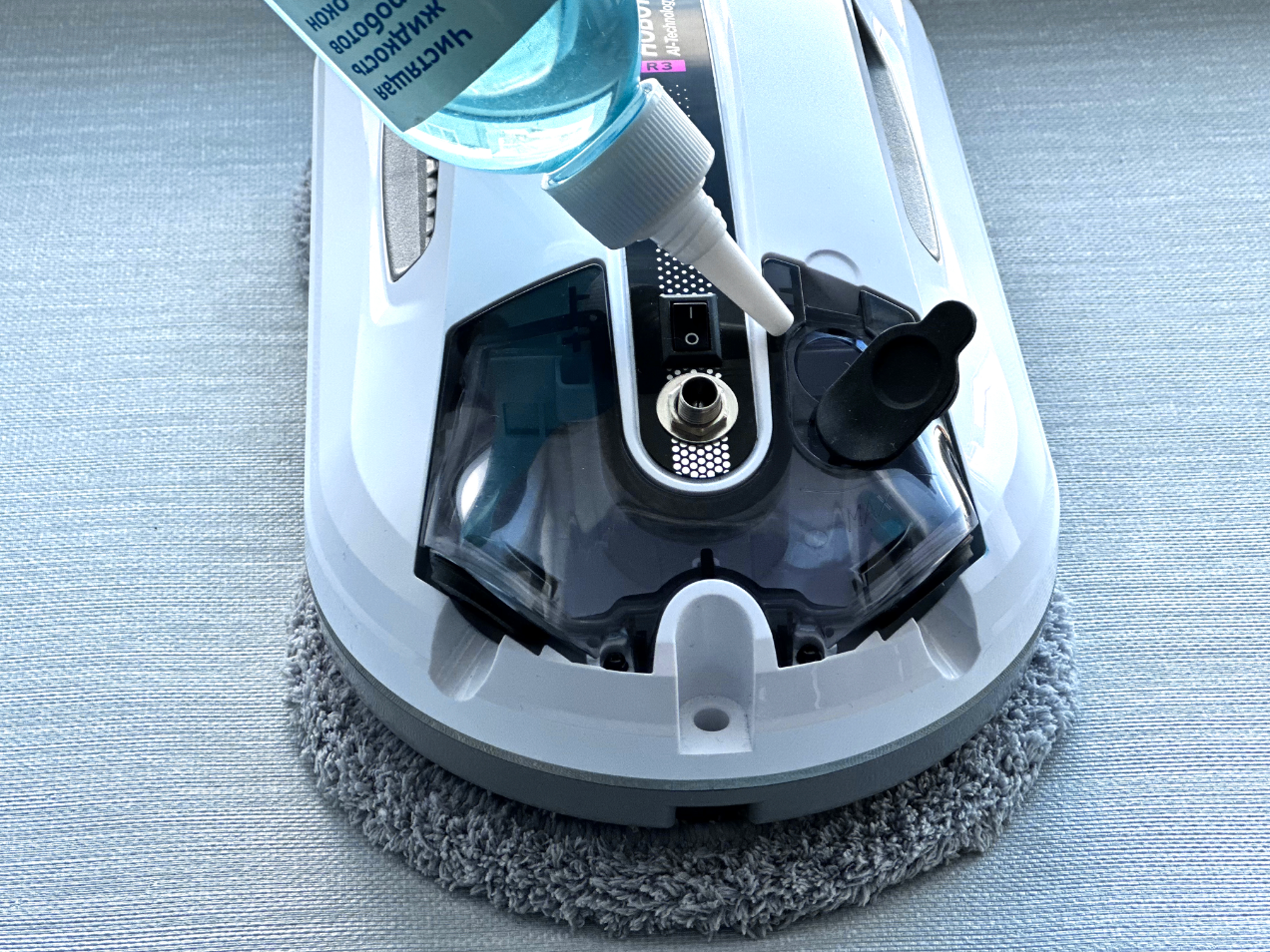 С другого края расположен тумблер включения робота, винтовое гнездо разъема питания, бак 40 мл для чистящей жидкости с заливным отверстием и двумя разнонаправленными распылительными модулями.