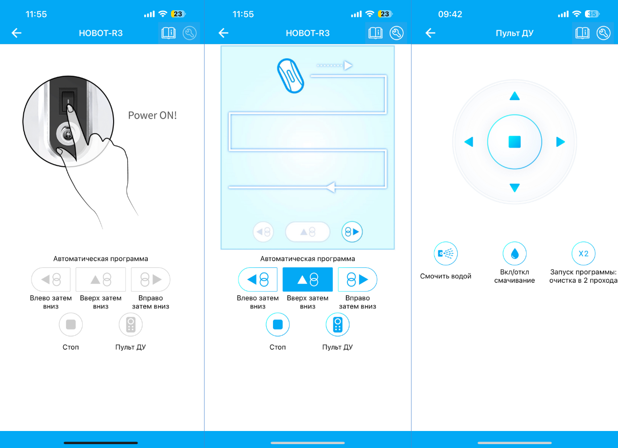 Пульт ДУ и Приложение (в т.ч. дублирует пульт ДУ) предусматривают три автоматических режима уборки и уборка с двойным проходом — для более глянцевого результата.