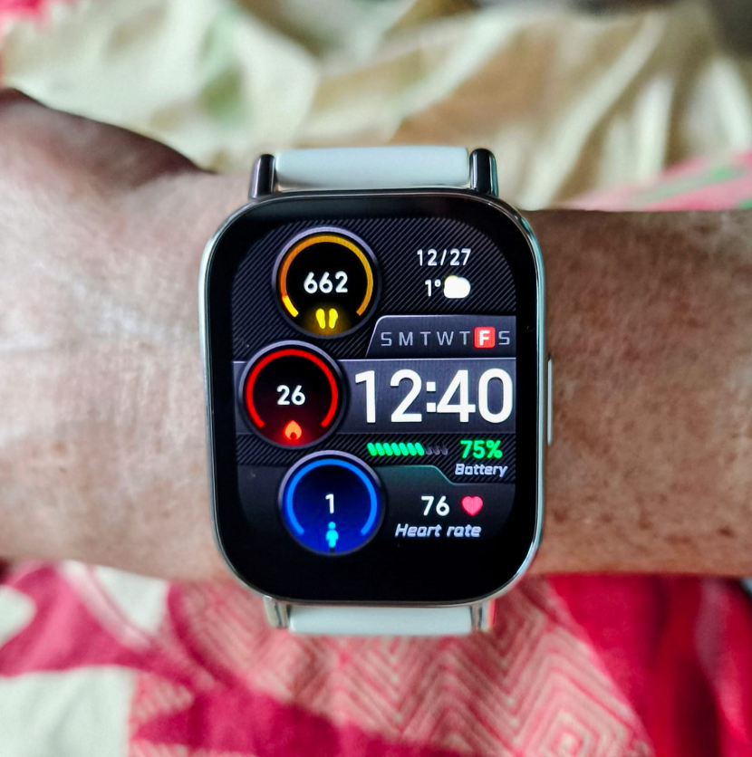 Первое, что бросилось в глаза, это большой экран с дисплеем AMOLED. Характеристики заявлены великолепные. Корпус красивый, тонкий, лёгкий. Вес всего 29.2 грамма, почти не ощущается на запястье. Я выбрал цвет белый золотистый. Минималистичный универсальный дизайн хорошо сочетается с разными стилями в одежде. От спорта до классики.