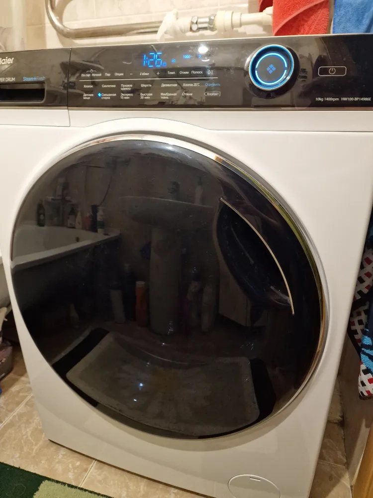 Больше других понравилась машина Haier HW100-BP14986E, у неё был абсолютно футуристический вид. Например, мне, большому любителю фантастики, открывающаяся дверца бака сразу напомнила то ли иллюминатор космического корабля, то ли переходной люк. И диаметр этого люка просто гигантский, я ни у одной другой модели такого не встречал. В общем, сразу понял, что влезет всё! Её и приобрел. Нет, конечно, это не любовь с первого взгляда, но в этом случае дизайн, не буду спорить, сыграл в моём выборе не последнюю роль.