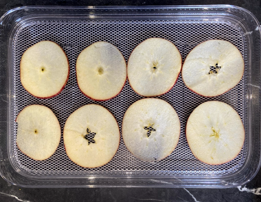 Нарезав яблоки на тонкие слайсы, разложила их на поддоны. Время приготовления яблок меньше, 7−9 часов при температуре 70 градусов.