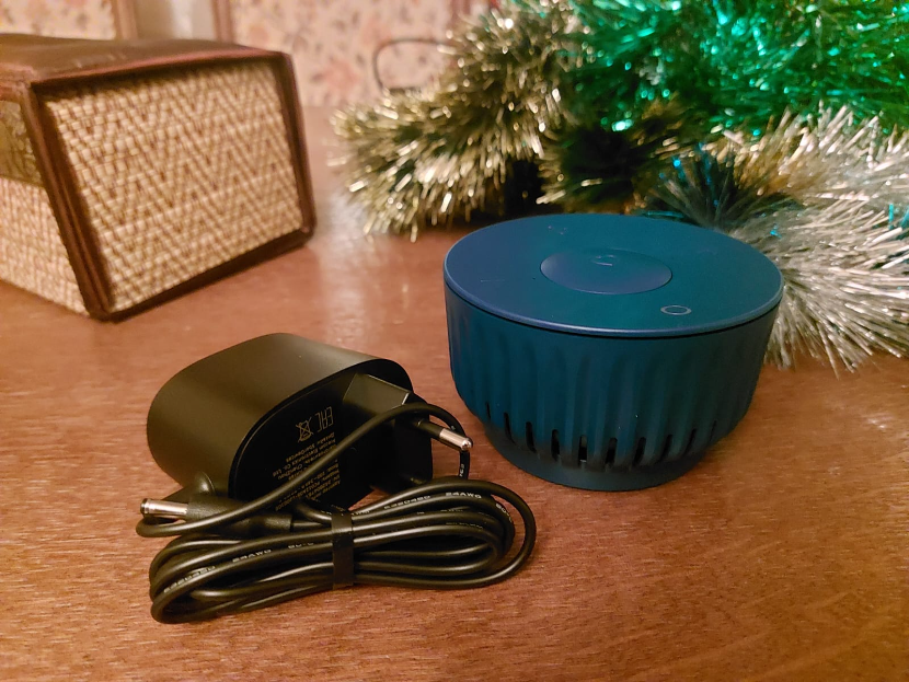 Внутри есть подробная инструкция о том, как подключить и какие возможности есть у устройства. В комплект входит шнур питания 1.8 метров. На блоке питания указаны параметры. Внешний вид одновременно лаконичный и стильный. Внешне похожа на какой-то элемент декора. Ребристая, по кругу идут отверстия динамиков.