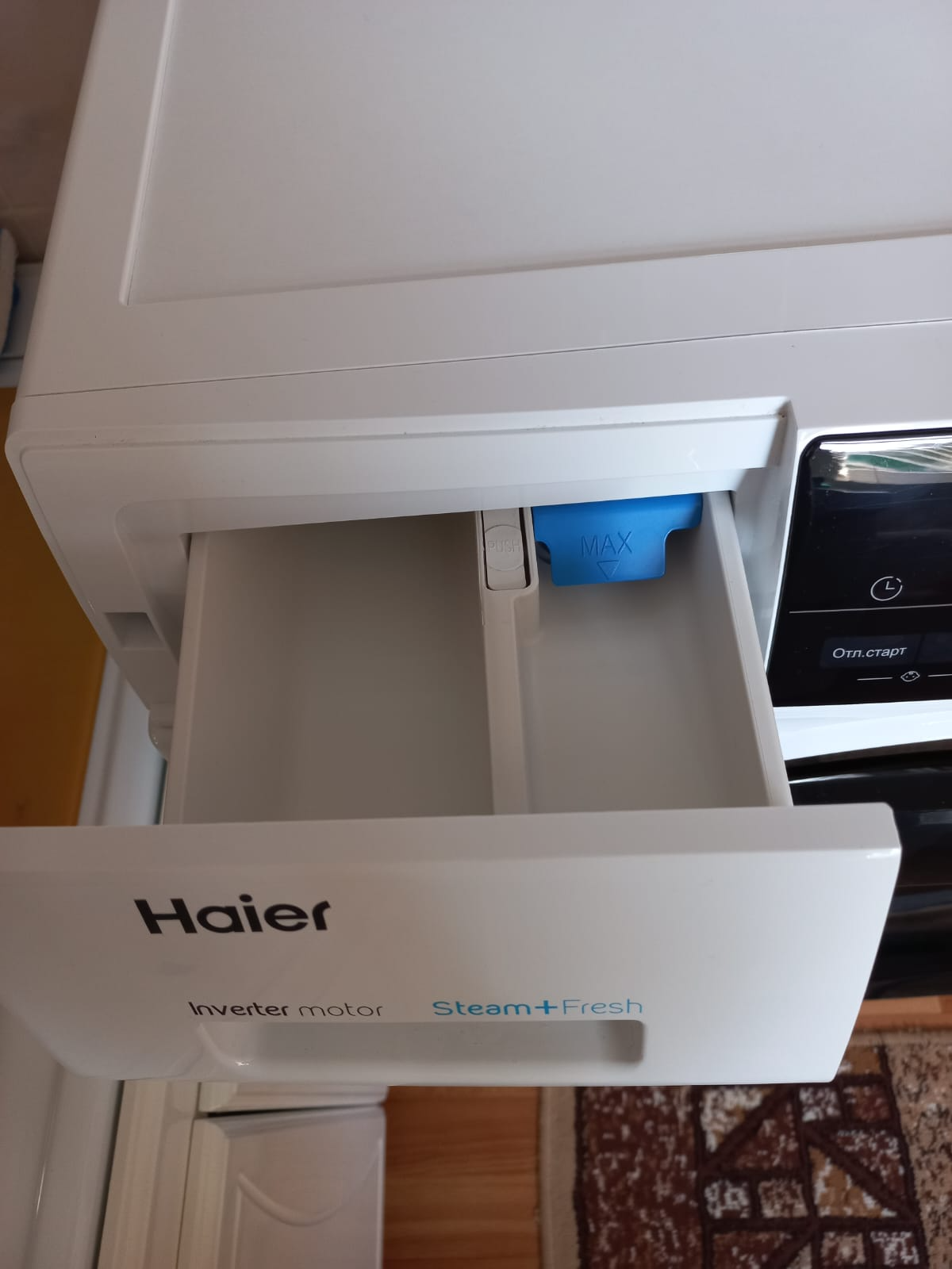 У машинки удобный контейнер для стирального порошка и кондиционера.