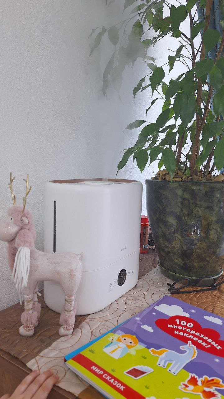 Преимуществ у увлажнителя вижу несколько: удобный отсек сверху для воды — его можно снять, налить воды и поставить на место; несколько режимов регулировки воздуха (детский самый мощный); есть звуковой индикатор, когда вода в отсеке заканчивается — не переживайте, он не орет, а слегка пискнет на 1 секунду. Знаю, что есть где-то отсек для ароматических масел, но я еще ни разу не использовала.