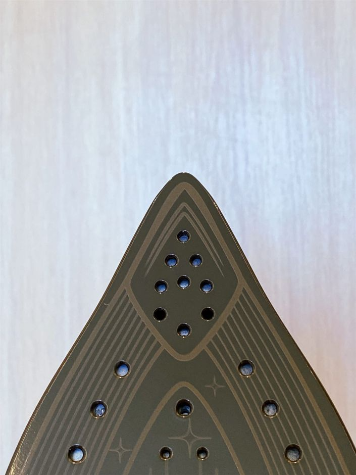 Начну, пожалуй, с главного. Подошва Durilium AirGlide с легкостью справится со всеми видами ткани, от самой грубой, до тончайшей органзы. Инновационная разработка помогает сократить время глажки, оставив его для более интересных занятий. Уникальность такой подошвы заключается в слое эмали, которая покрывает металлическую основу. Внешне такое покрытие напоминает ударопрочное стекло, такое же гладкое. Подошва легко скользит, она практически не царапается и не окисляется, и имеет антипригарные свойства, частички ткани к ней не прилипают. На подошве есть желобок для фурнитуры, и пуговички и клепки могут не боятся быть оторванными или оплавленными. Вытянутый носик утюга позволяет разглаживать ткань в труднодоступных местах. На подошве продуманно расположены с полсотни отверстий, паровая подушка равномерно распределяется по всей поверхности.