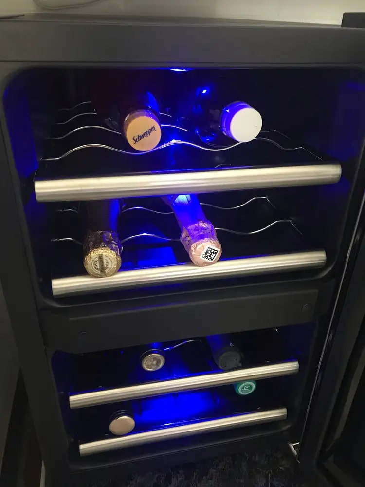 Как только принял доставку — тут же распаковал и включил его. Правда, сначала пустым, чтобы понять, как он работает. Выставил в верхней зоне 15 градусов, а в нижней — 10. Шкаф в рабочий режим вошел через два-три часа. Вот тогда и загрузил его вином и соком. Отмечу, что цифры на дисплее, показывающие температуру, светят очень ярко: ночью они — полноценная подсветка на кухне, и это даже без включённой подсветки камеры, с ней на кухне видно вообще всё. Ещё что заметил: чистоту внутри. Видимо, из-за того, что дверца очень плотно присасывается к торцевой поверхности корпуса. Да, и конечно же регулярно охлаждаю в нём и водку с виски, если на выходных что-то планируется. Выставляю температурный минимум для крепкого, это 10 градусов, шкаф справляется с двумя-тремя бутылками за час-два, не больше. В общем, удобная штука, и прежде всего в том, что весь алкоголь в одном месте, теперь не надо искать его по кухонным полкам или в холодильнике.