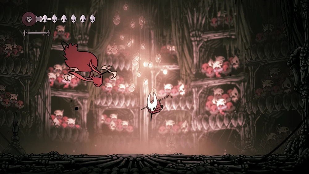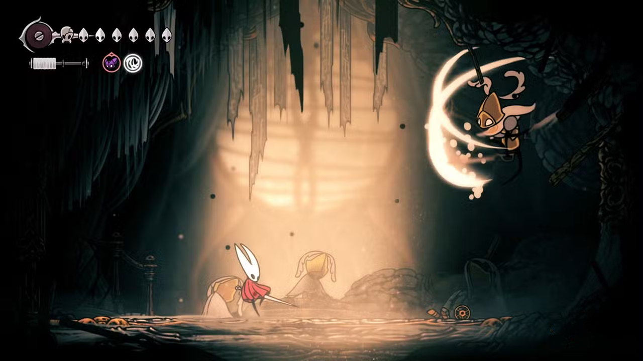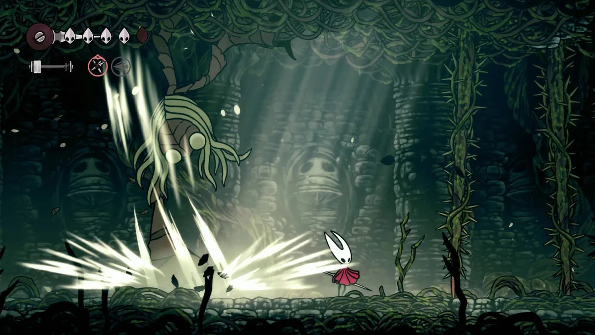 Босс наиболее уязвим в момент замаха — здесь нужно уклониться в противоположную сторону, а затем бить в ответ. Также обязательно нужно выносить лозы в центре арены — они сильно ограничивают Хорнет. Когда появляется сразу несколько лоз, их можно убрать Шелковым копьем. Перед боем стоит активировать лифты‑шорткаты — они сократят путь до арены.