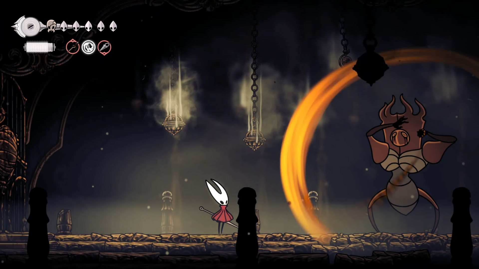 Встретился на границе Мшистого грота и Костяка. Он выныривает из земли, мчится по прямой, взмывает дугой и обрушивает на арену колокола. Перед боем его нужно освободить, разрезав нити «Шелковым копьем», а после победы он становится транспортом между станциями.