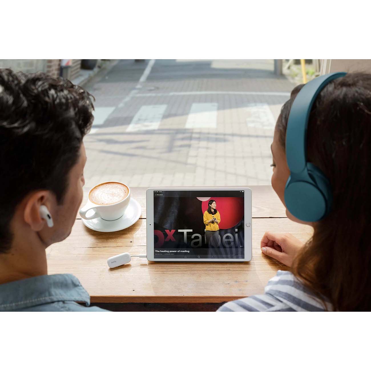 Прибор соединяется с источником через разъём 3,5 мм и передаёт звук с помощью модуля Bluetooth на гарнитуру. Аксессуар совместим с большинством моделей современных наушников, включая AirPods. Кроме этого, вы можете синхронизировать с адаптером сразу две гарнитуры, чтобы, например, посмотреть кино с другом.