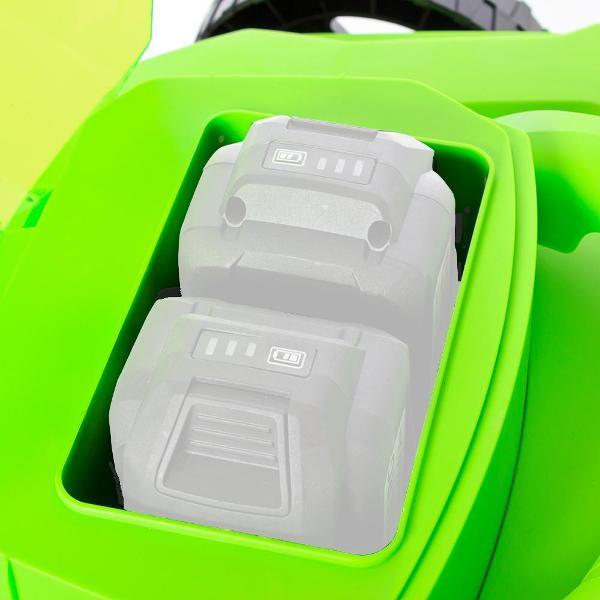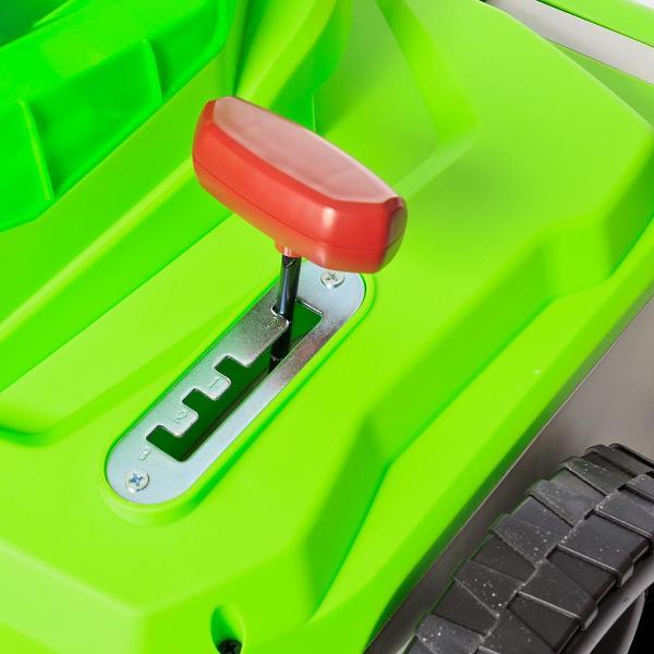 Легкое передвижение обеспечивают колеса. Диаметр передних — 18 см, задних — 10 см. Корпус сделан из пластика и стали, окрашен в зеленый цвет. Высоту ручки можно менять. Во время хранения штанга компактно складывается. Габариты конструкции 35х60х46 см, вес — 11 кг.