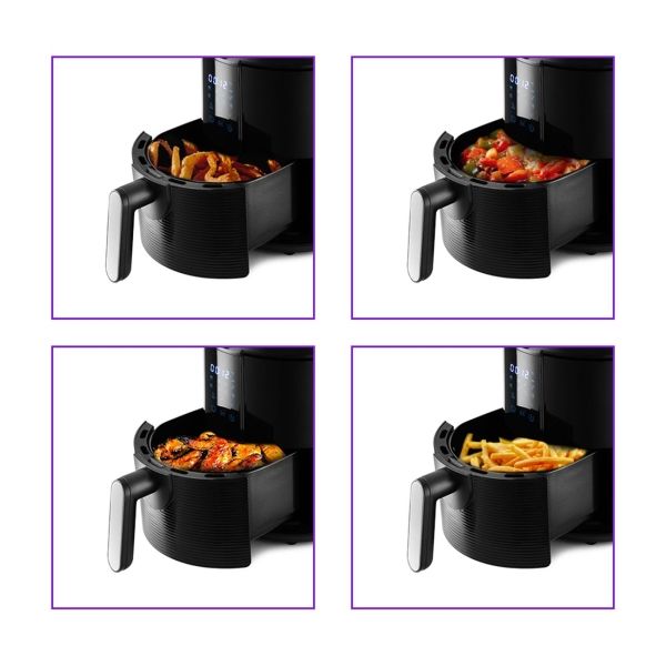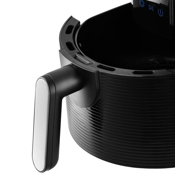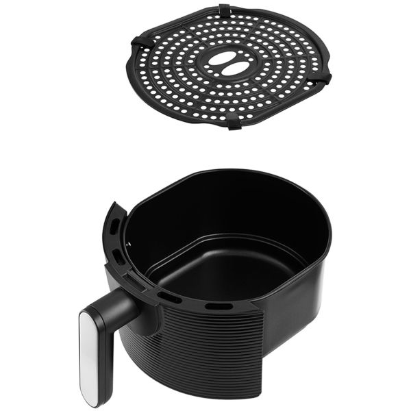 Корзина объемом 3 л оснащена антипригарным покрытием, что позволяет готовить без масла. Поддон и корзина легко вынимаются для очистки. Конструкция снабжена защитной кнопкой для безопасности. Длина провода составляет 1 м, вес аэрогриля — 3,4 кг.
