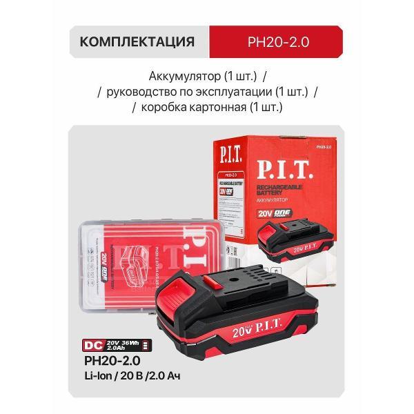 Вы можете купить Аккумулятор для электроинструмента P.I.T. PH20-2.0 в магазинах М.Видео по доступной цене. Аккумулятор для электроинструмента P.I.T. PH20-2.0: подробное описание, фото и отзывы реальных покупателей, характеристики, возможность скачать инструкции и подобрать аксессуары.