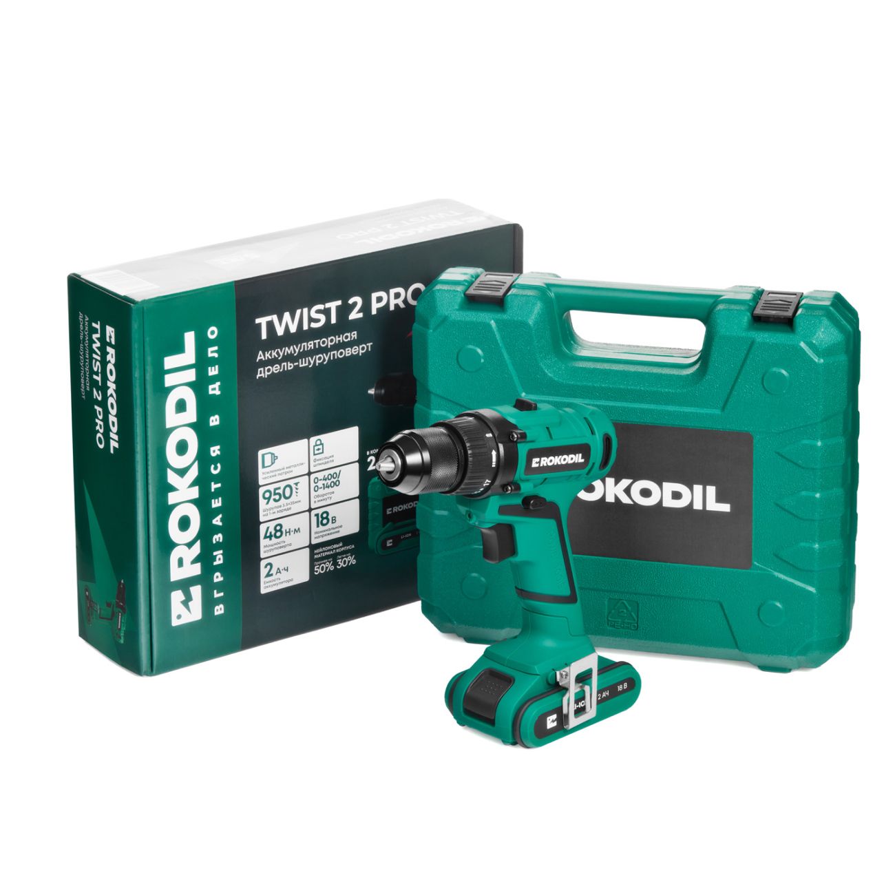 Электрическая дрель Rokodil 1045101 работает от аккумулятора емкостью 2000 мА*ч. На зарядку уходит в среднем 1,5 часа. Мощность двигателя — 48 Нм. Мотор оснащен многоуровневой защитой, которая исключает поломки при перегрузках. Число оборотов регулируется в диапазоне от 400 до 1400 в минуту. Предусмотрена подсветка рабочей зоны. Максимальный диаметр сверления по дереву, камню, бетону составляет 36 мм. Предусмотрен режим «Реверс» для демонтажа уже вкрученных шурупов.