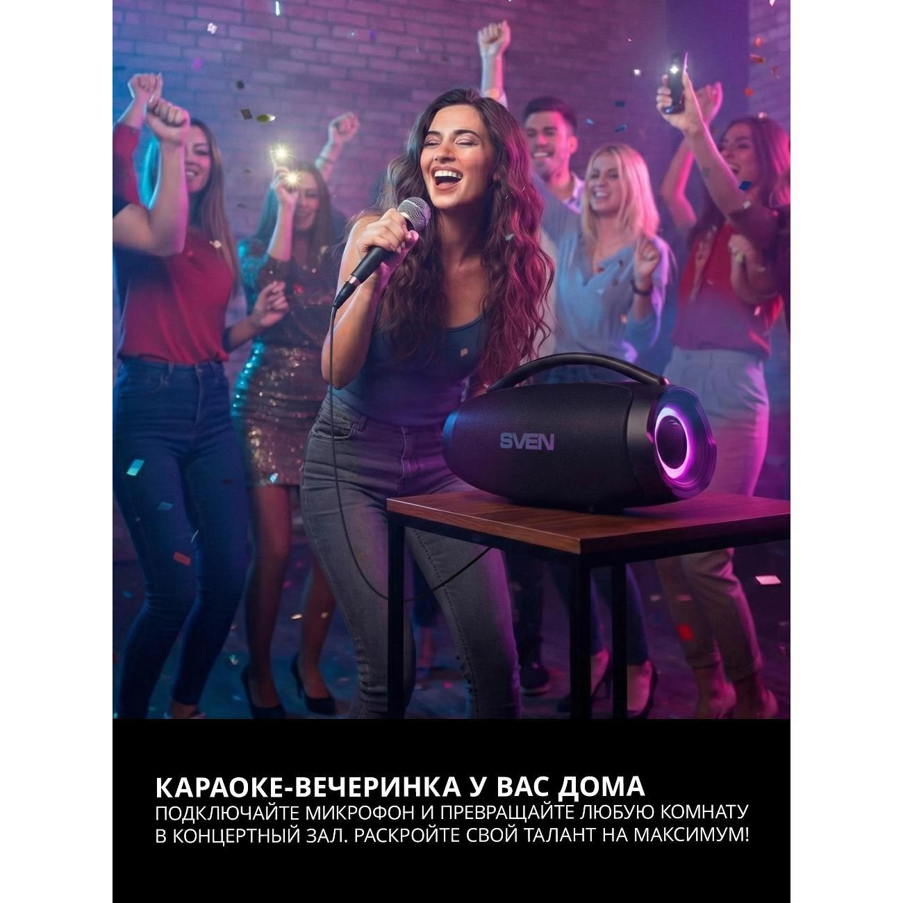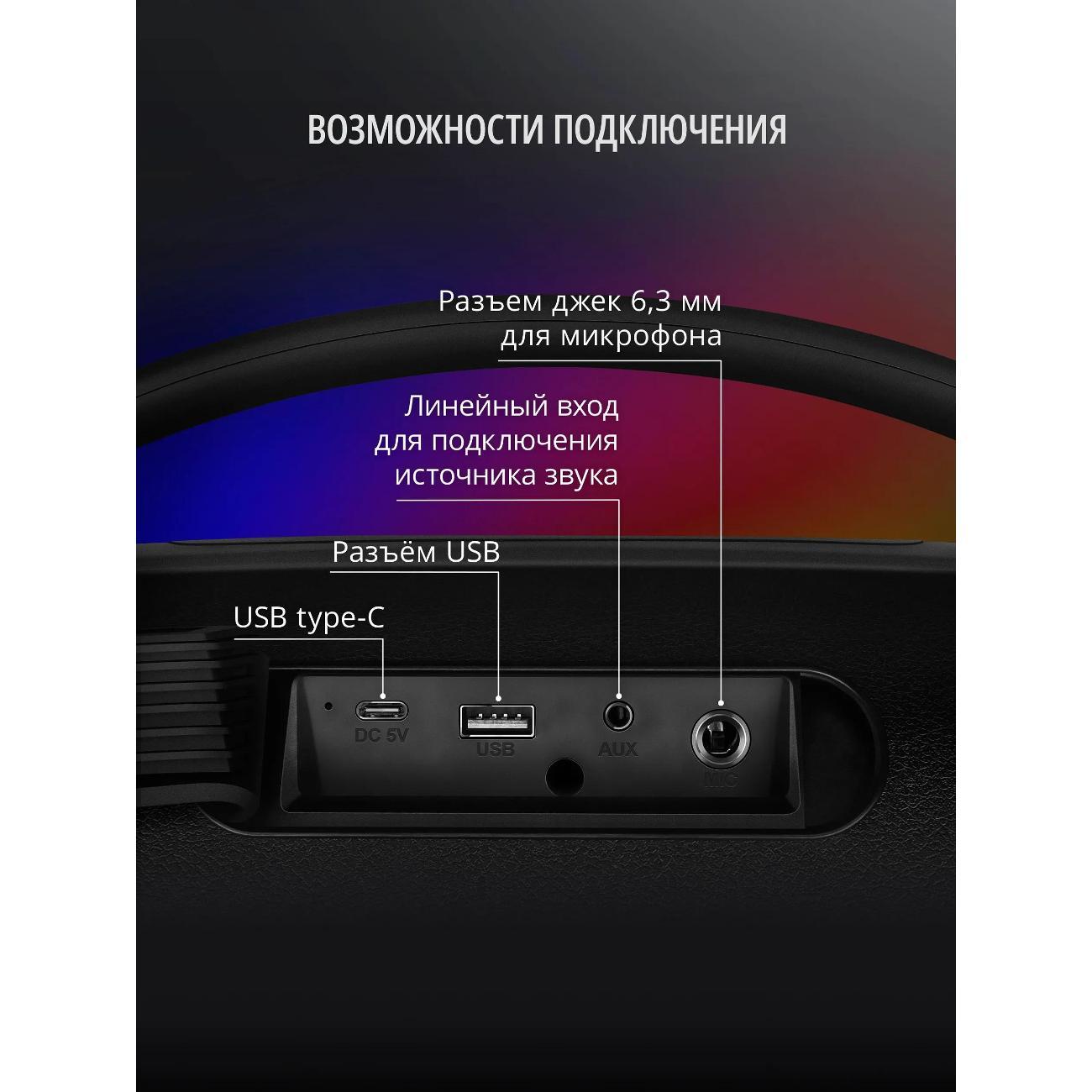 Переносная колонка имеет функцию караоке, что позволяет устраивать домашние и выездные мероприятия. Для подключения микрофона предусмотрен микрофонный вход Jack 6,3 мм. Аудиосистема может работать до 22 часов при 30% громкости, благодаря аккумулятору емкостью 4500 мА·ч. Устройство оснащено USB разъемом для флешки, а также имеет AUX вход для подключения внешних источников.