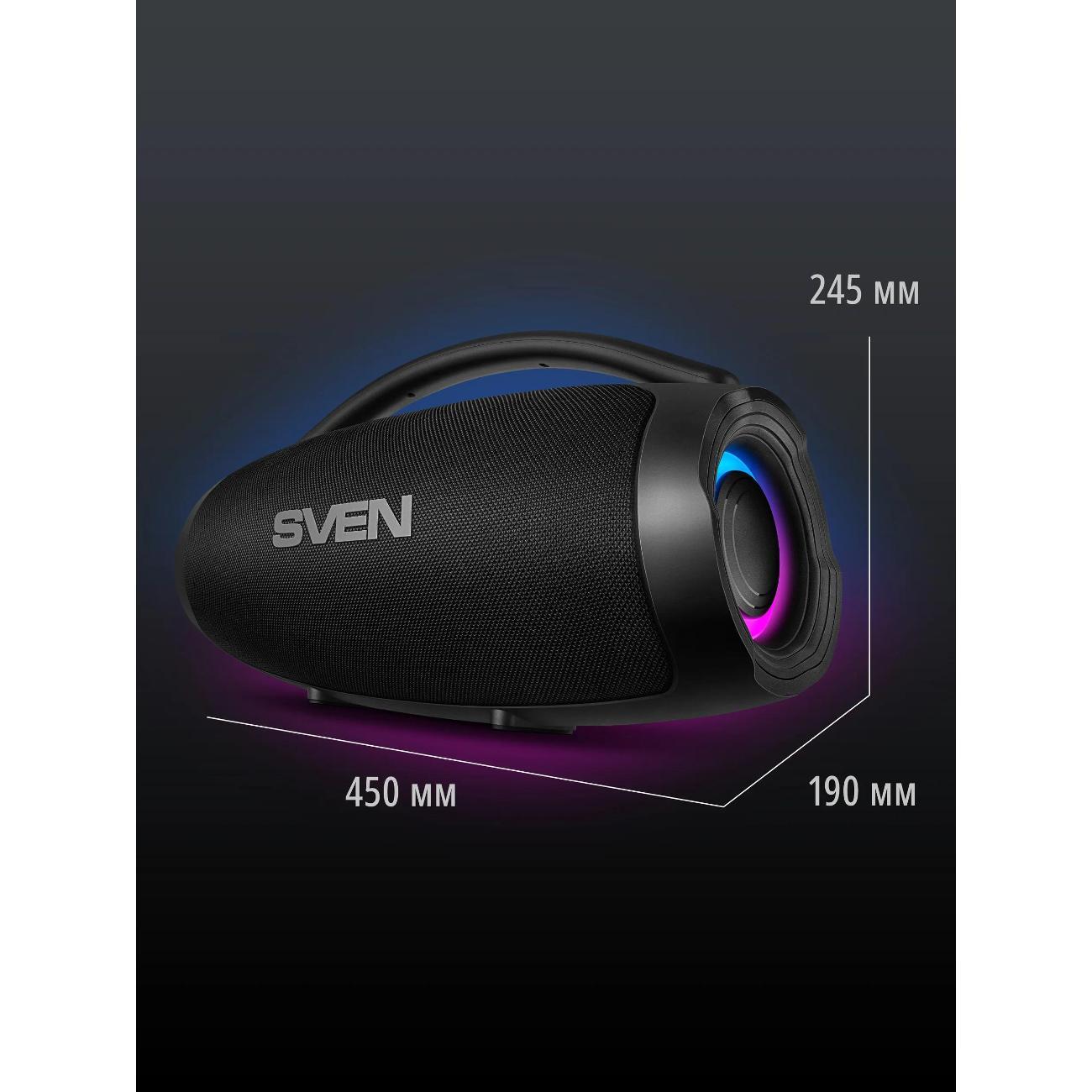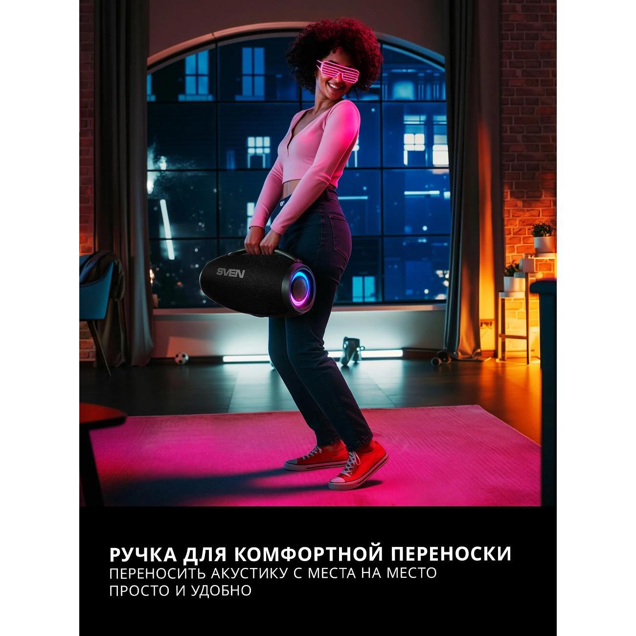 Также возможно беспроводное подключение двух колонок к одному источнику звука по технологии TWS, что создает стереоэффект и наполняет пространство музыкой. Стерео бумбокс оборудован динамической отключаемой RGB подсветкой. Подходит для использования как дома, так и на улице.