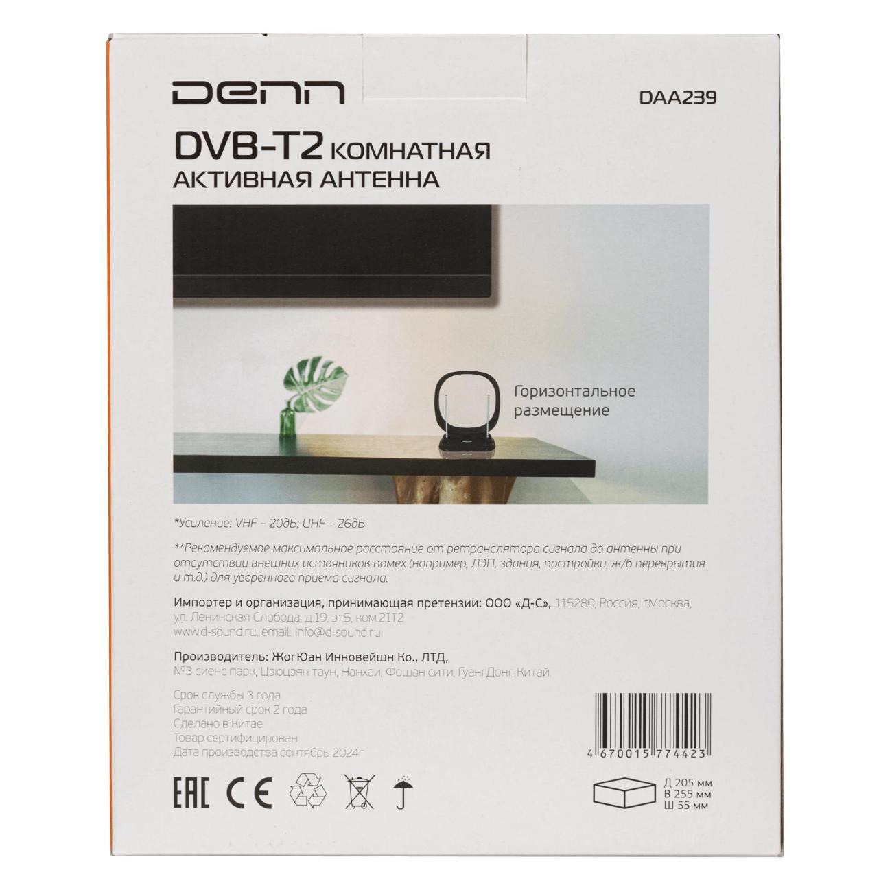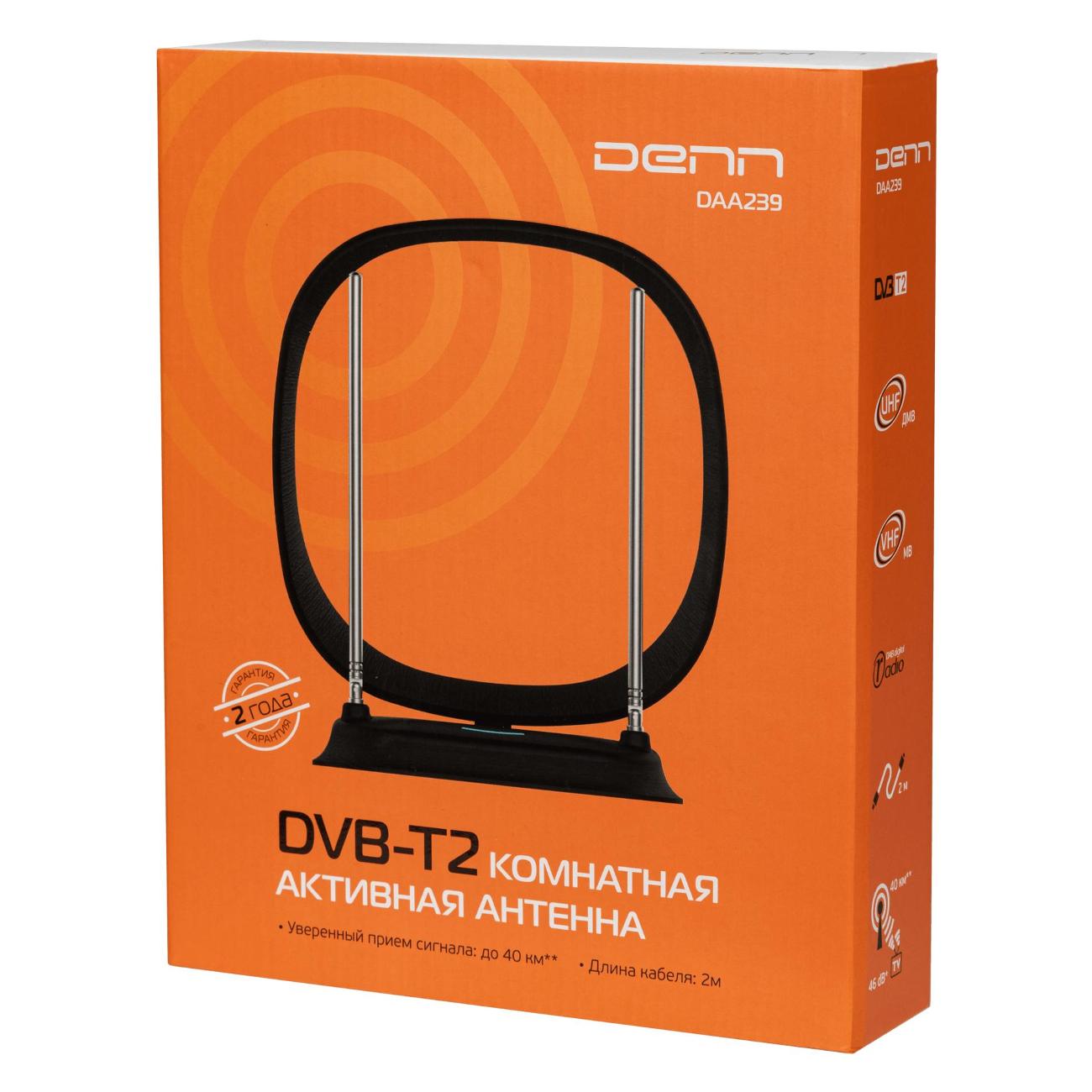 Телевизионная комнатная антенна Denn DAA239 позволяет принимать большое количество цифровых и аналоговых каналов. Одним из преимуществ модели являются коэффициенты усиления диапазонов UHF и VHF, соответственно, 20 и 26 дБ.