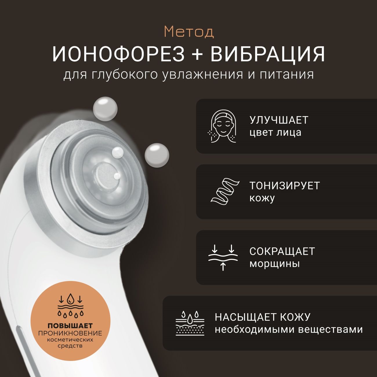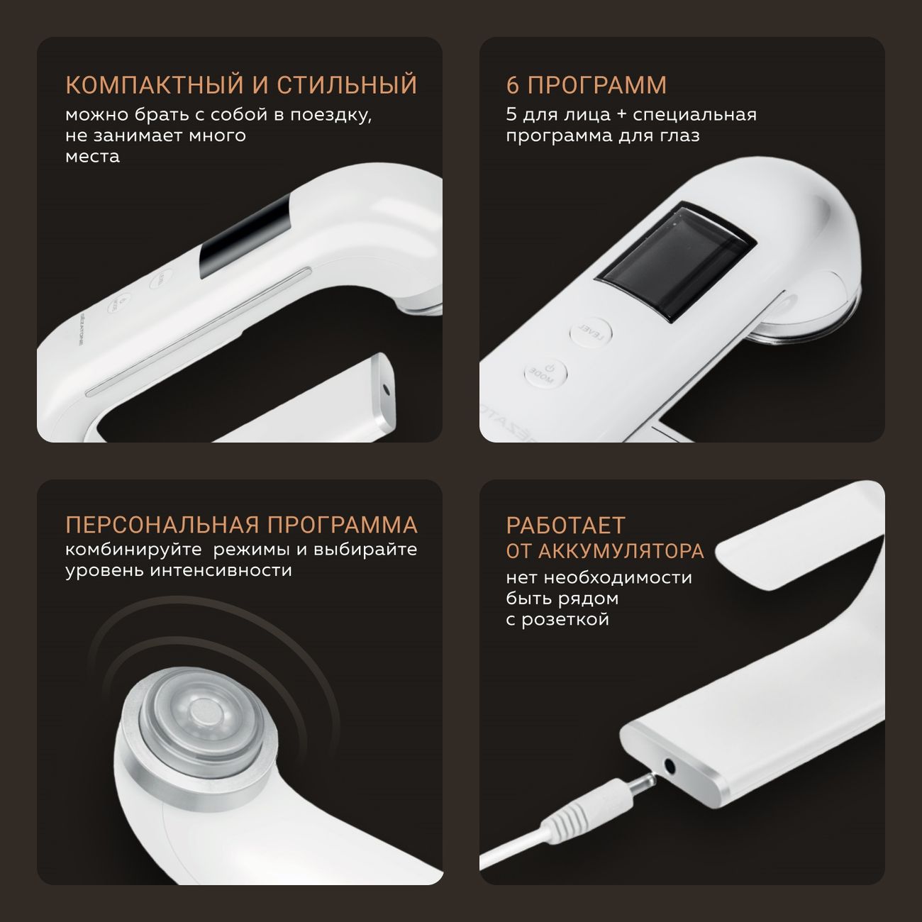 Корпус прибора белого цвета, скобообразная ручка обеспечивает удобное применение. Питание устройство получает от аккумулятора. Длительность одной процедуры — 15 минут. Размеры аппарата — 17,8х4,2х8,35 см, вес — 550 г. В комплекте есть зарядное устройство и магнитное кольцо.