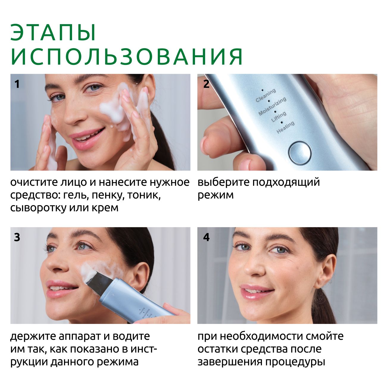 • Ультразвуковой микромассаж стимулирует выработку коллагена и эластина, обеспечивает заметный лифтинг-эффект, разглаживает морщины, устраняет дряблость.
