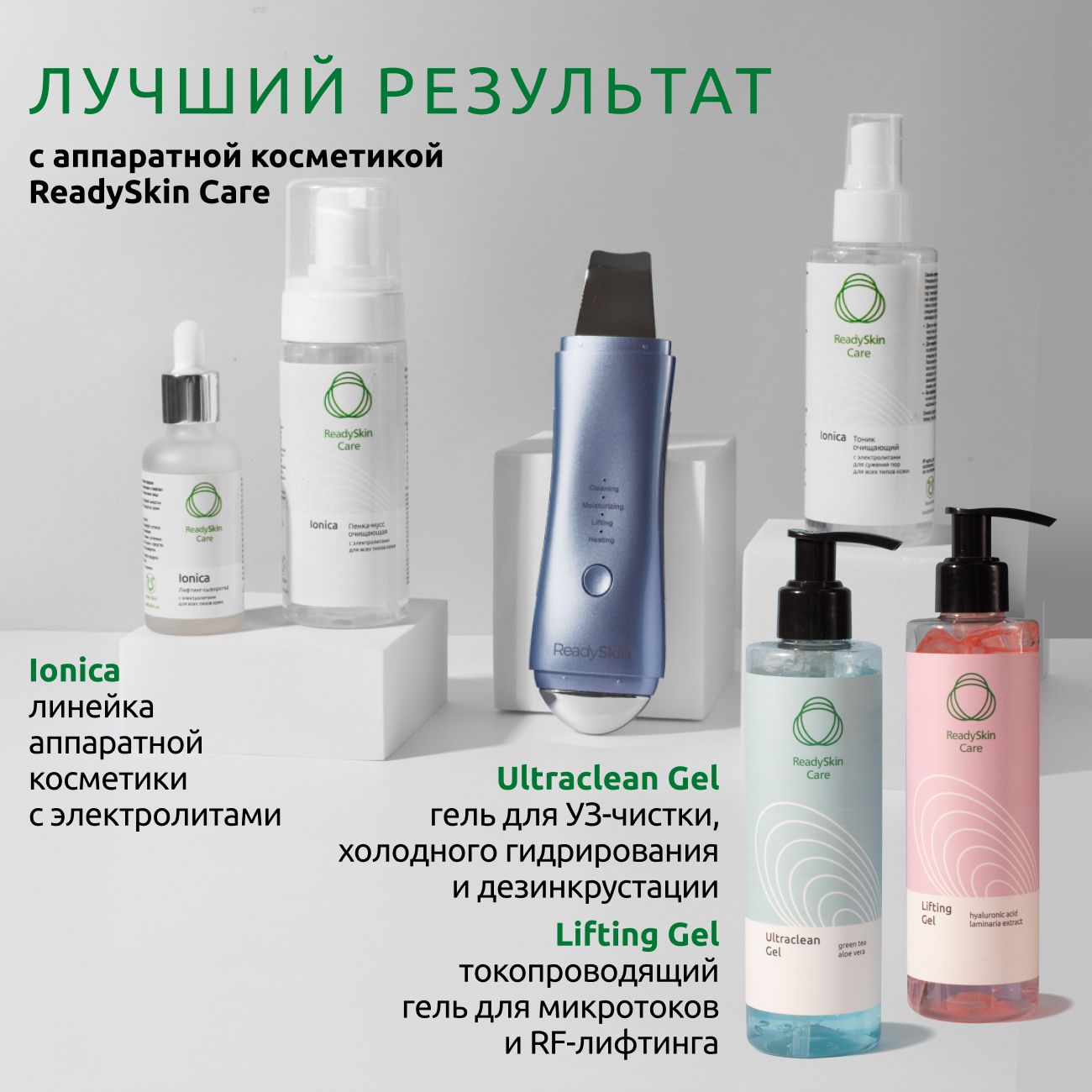 ReadySkin ZY8300 – это многофункциональный ультразвуковой аппарат для лица, который позволяет на дому выполнять косметологический уход профессионального уровня. В модели предусмотрены 4 режима и 6 функций, способные полностью заменить необходимость регулярно посещать косметолога и тратиться на салоны красоты. Результат от применения прибора – гладкая, упругая, чистая кожа с ровным тоном, без прыщей и черных точек, расширенных пор, пигментации и морщин. Бьюти-гаджет разработан при использовании новейших технологий Южной Кореи. По отзывам пользователей, это один лучших приборов для уз чистки по соотношению цена/качество, если сравнивать с моделями популярных брендов Doctor Comfort, Gezatone, Gess, Dream Beauty. В ReadySkin ZY8300 есть 6 функций для сохранения здоровья, красоты и молодости кожи:
