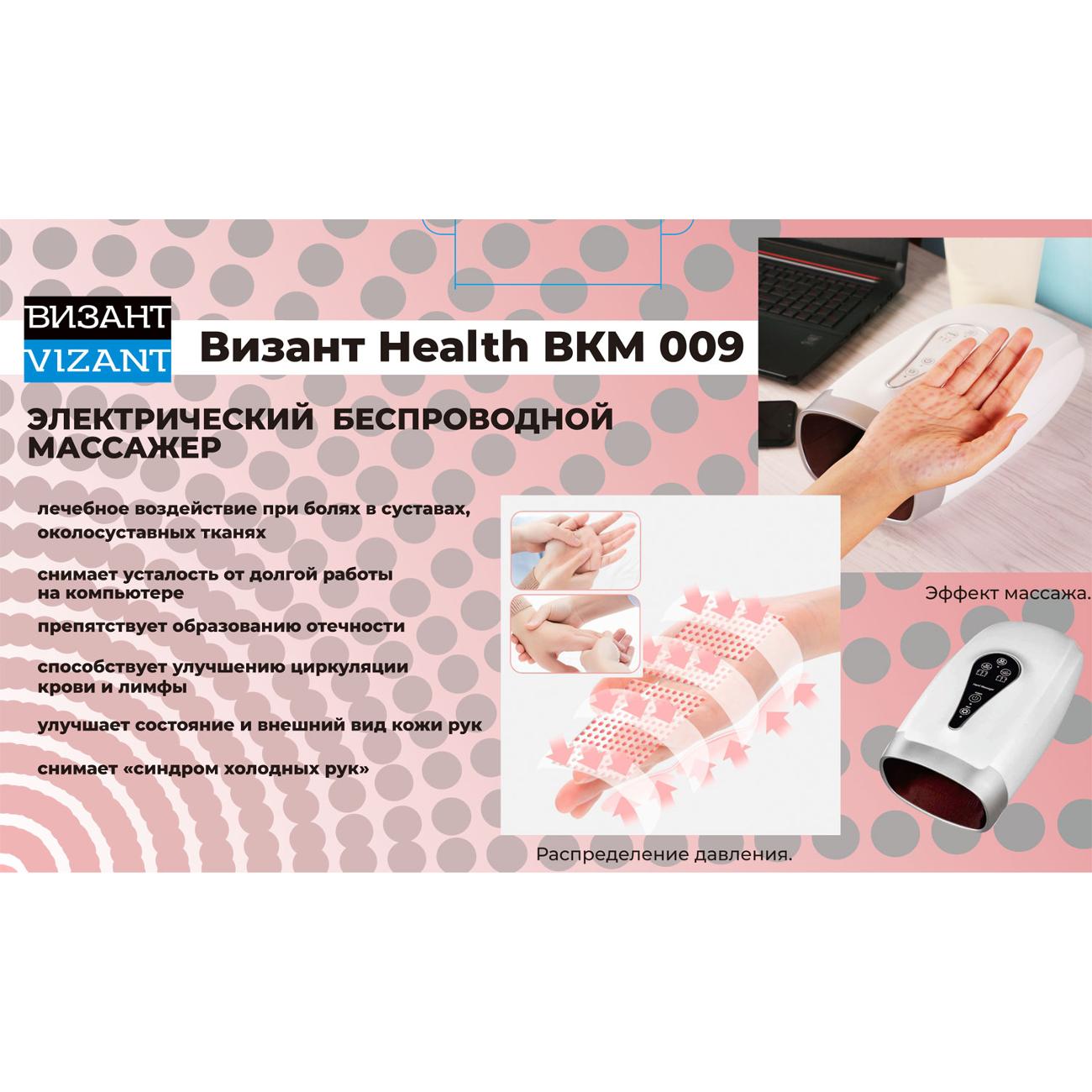 Аппарат прессотерапии Vizant ВКМ009 беспроводного типа размером 15х15х30 см весит 1 кг и потребляет 30 Вт электроэнергии при функционировании от собственного аккумулятора. Устройство используется в лечебных целях: для снижения отеков, уменьшения боли в суставах, снятия синдрома усталости при длительной работе и т.п. Манжета обеспечивает давление до 300 мм рт. ст.