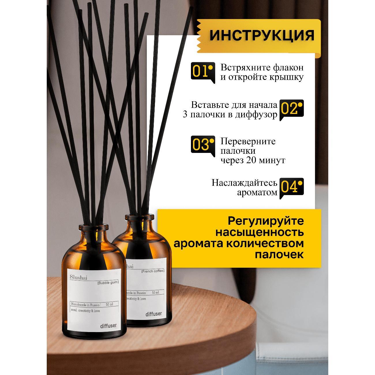 В заказе идут два диффузора, где каждый состоит из стеклянного флакона объемом 50 мл с парфюмированной ароматной жидкостью и 8 фибровых аромапалочек, обладающих большой поглощающей способностью. Особенно удобно то, что Вы сможете сами регулировать интенсивность домашнего освежителя, добавляя или уменьшая количество палочек.